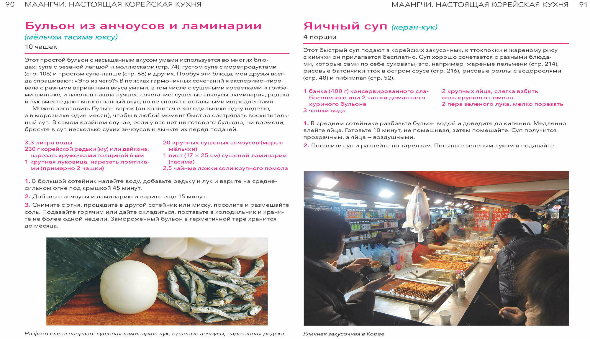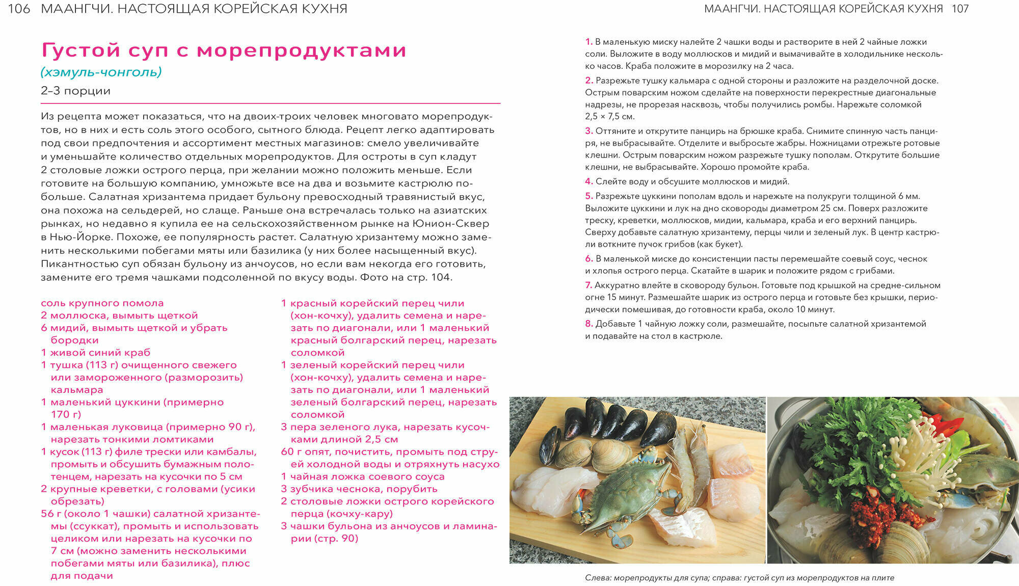 Например, начинающим будет интересно приготовить овощной суп с пряной говядиной и блинчики с морепродуктами и зеленым луком. Целая глава посвящена приготовлению кимчхи и маринованию. Панчханы, или гарниры (паровой баклажан, жаренный на сковороде тофу с пряным приправочным соусом и освежающий холодный огуречный суп) — столпы корейской кухни и полноценная трапеза.