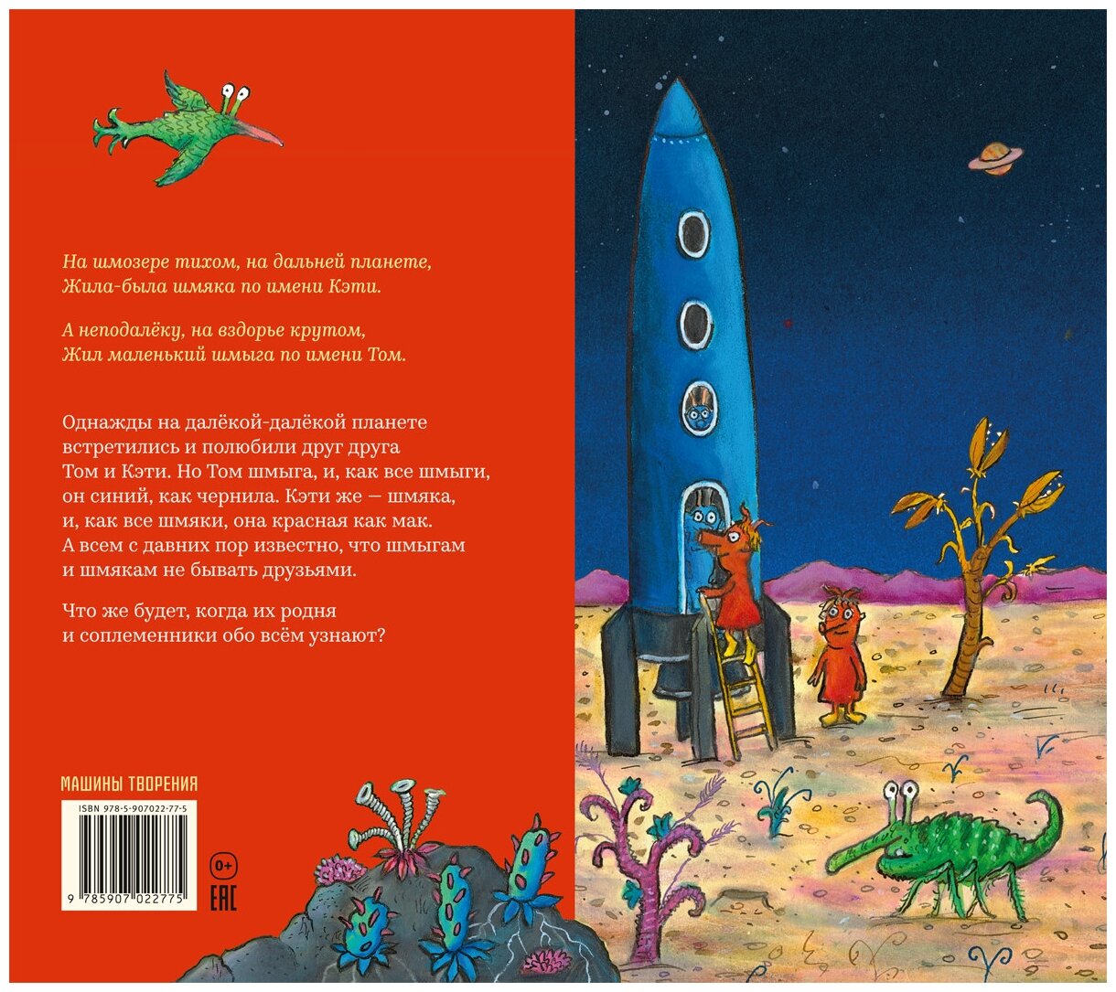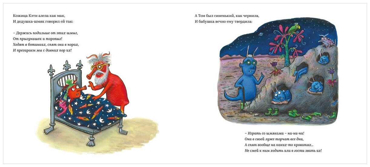 На шмозере тихом, на дальней планете Жила-была шмяка по имени Кэти. А неподалёку, на вздорье крутом Жил маленький шмыга по имени Том. Однажды на далёкой-далёкой планете встретились и полюбили друг друга Том и Кэти. Но Том шмыга, и, как все шмыги, он синий, как чернила. Кэти же - шмяка, и, как все шмяки, она красная как мак. А всем с давних пор известно, что шмыгам и шмякам не бывать друзьями. Что же будет, когда их родня и соплеменники обо всём узнают? Возраст: от 3-х лет.