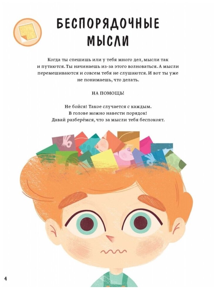Выберите задание, которое, по вашему мнению, нужно ребенку именно сейчас. Например, ваш ребенок очень неуверен в себе, его одолевают грустные мысли. Откройте страницу 16 с заданием про мысли в облаках (в разделе "Развороты" вы можете познакомиться с этой страницей). Прочитайте грустные и неприятные мысли. Потом возьмите наклейки и измените грустные мысли на приятные! Вы сами заметите, как настроение поднимется, а в теле станет тепло.