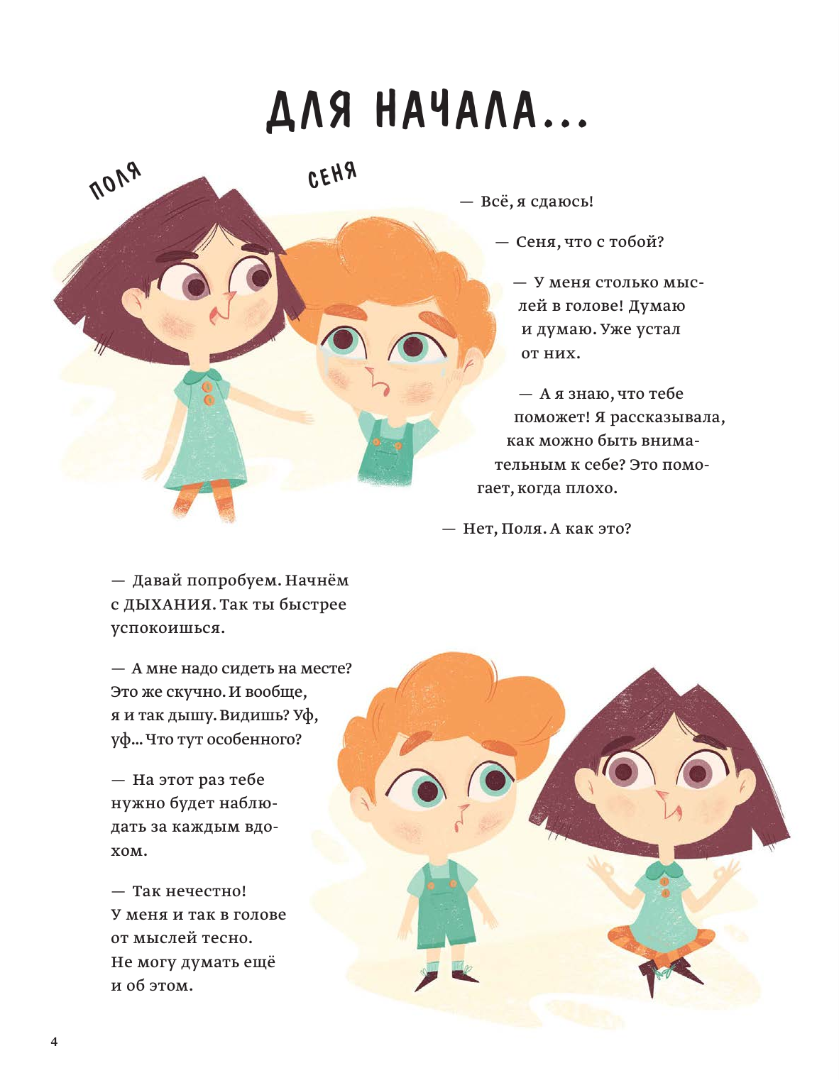 Впервые пишу отзыв. Книгу забрала домой, сразу стали её читать с сыном 8 лет и поняли, что это что-то непонятное. Вся книга содержит один, всего один совет, а именно: «сядь, закрой глаза и дыши». Далее автор предлагает представить то или иное место/предмет/животное/действие и тд. Мне слабо представляется ребёнок, который при расстройстве или обиде, отходит в сторону, садиться, закрывает глаза, ровно дышит, слушает своё дыхание и представляет себе бабочку например. И за счёт этого успокаивается. Такой метод советуется при любых чувствах. Много мыслей в голове? Сядь, подыши. Ты только проснулся? Сядь, подыши. И тд.