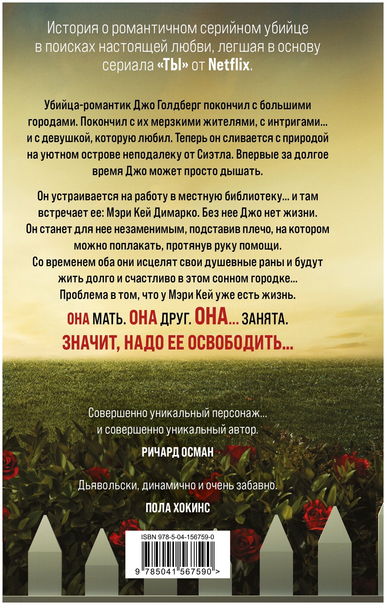 Блестящее продолжение мирового бестселлера "Ты" и Новая ты". Сплав "Над пропастью во ржи" с "Американским психопатом", "Исчезнувшей" и "Мизери". Язык повествования настолько силен и достоверен, что кажется, будто главный герой сам написал эти книги. Компания Netflix экранизировала трилогию в одноименном сериале.