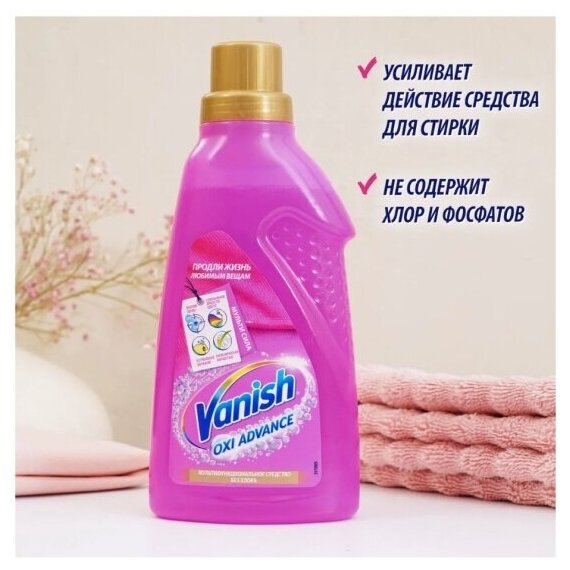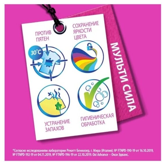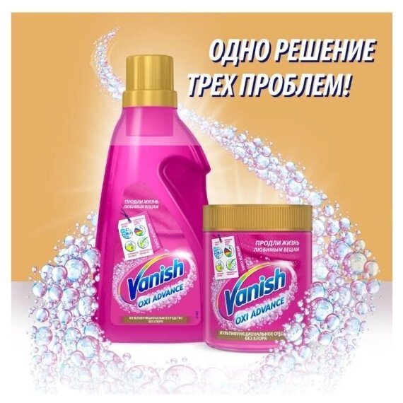 Vanish Мультисила – новое мультифункциональное средство без хлора для усиления качества стирки цветных тканей. Теперь Ваниш не только эффективно удаляет пятна, но и предотвращает окрашивание ткани, избавляет от неприятного запаха и производит гигиеническую обработку! Ваниш Мультисила – одно решение трех проблем! Продли жизнь любимым вещам с Vanish!Преимущества Vanish Oxi Advance: Пятновыведение даже в холодной воде (На основании исследований лаборатории Рекитт Бенкизер г. Мира (Италия) № FTNPD-190-19 от 16.10.2019, № FTNPD-192-19 от 04.11.2019. Холодная вода- вода с температурой 30 °C);Сохранение яркости цвета (На основании исследований лаборатории Рекитт Бенкизер г. Мира (Италия) № FTNPD-190-19 от 16.10.2019, № FTNPD-192-19 от 04.11.2019. Холодная вода- вода с температурой 30 °C);Устранение запахов (В отношении запахов пота и запаха от ног согласно исследованию лаборатории Рекитт Бенкизер, г. Мира (Италия) № FTNPD-196-19 от 22.10.2019 г.);Гигиеническая обработка ( Гигиенический эффект достигается за счет усиления действия средств для стирки);Не содержит хлор.Правила использования: Предварительная обработка: Смешайте ¼ ложки средства с ¾ ложки воды; Нанесите смесь на пятно и оставьте максимально на 5 мин; При необходимости потрите; После предварительной обработки стирайте как обычно или тщательно прополощите;Замачивание: Добавьте 60 г средства на 4 л воды; Максимальное время замачивания для цветных вещей 1 час, температура замачивания 40°С; После замачивания стирайте как обычно или тщательно прополощите; Для лучшего результата перед полосканием потрите;Стирка: Добавьте к вашему стиральному порошку 60 г пятновыводителя.Меры предосторожности:Хранить в недоступном для детей месте! Вызывает серьезное раздражение глаз. Вызывает раздражение кожи. Не допускать попадания в глаза, на кожу или одежду. При попадании в глаза осторожно промыть водой в течение нескольких минут. При наличии удалить контактные линзы и продолжить промывание. Если раздражение глаз не проходит, обратиться к врачу, взяв с собой упаковку продукта или этикетку. Не глотать. При проглатывании промыть рот водой и обратиться к врачу. При попадании на кожу может произойти отбеливание. Эффект отбеливания является временным и обратимым. Промыть большим количеством воды. При чувствительной коже использовать защитные перчатки. Не смешивайте с другими средствами. Хранить в сухом и прохладном месте, вдали от прямых солнечных лучей при температуре не выше + 30 °С. Состав: 30% и более: кислородсодержащий отбеливатель; менее 5%: анионные ПАВ, неионогенные ПАВ, цеолиты, энзимы.