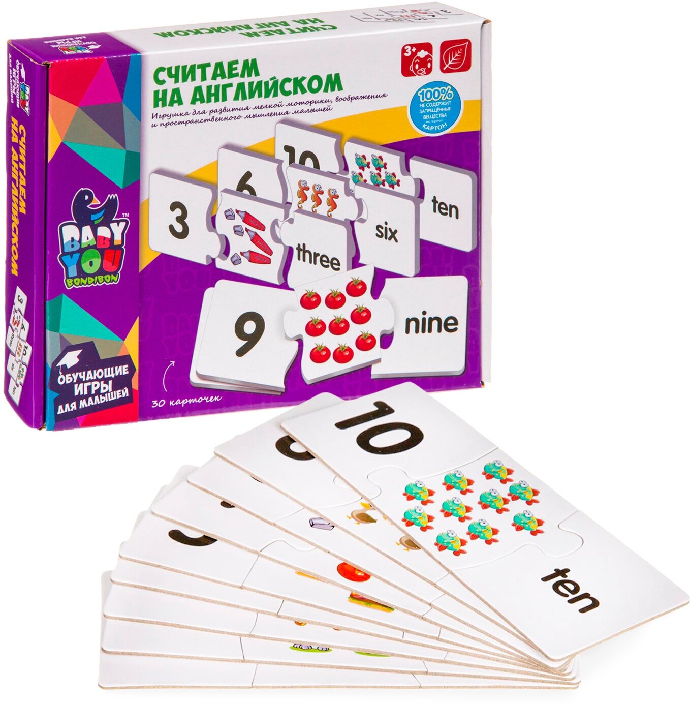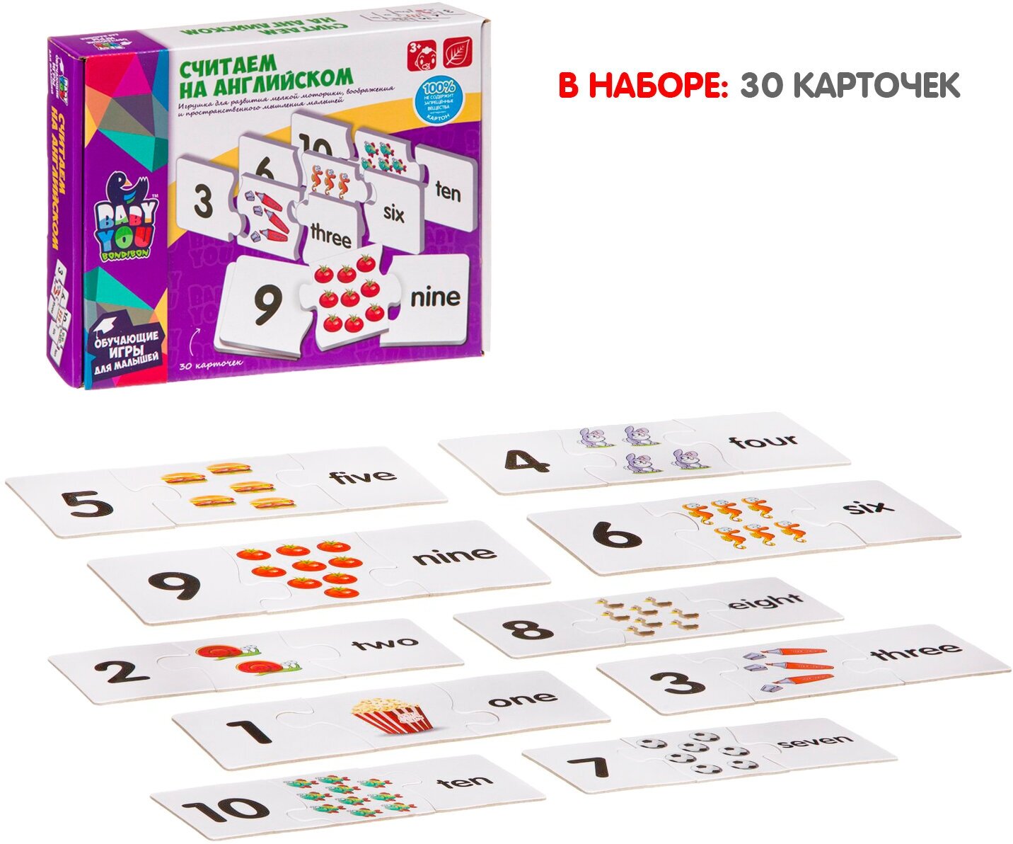 Набор карточек-пазлов предназначен для детей от 3-х лет и поможет в изучении цифр, счета на английском языке. Состоит из трех частей, одна из которых показывает цифру, другая количество предметов при счете, третья название на английском языке. Ребенку необходимо собрать все части, правильно подобрав соответствующие карточки. Способствует в развитии логического мышления, внимания, памяти, воображения и мелкой моторики. В наборе 30 карточек.