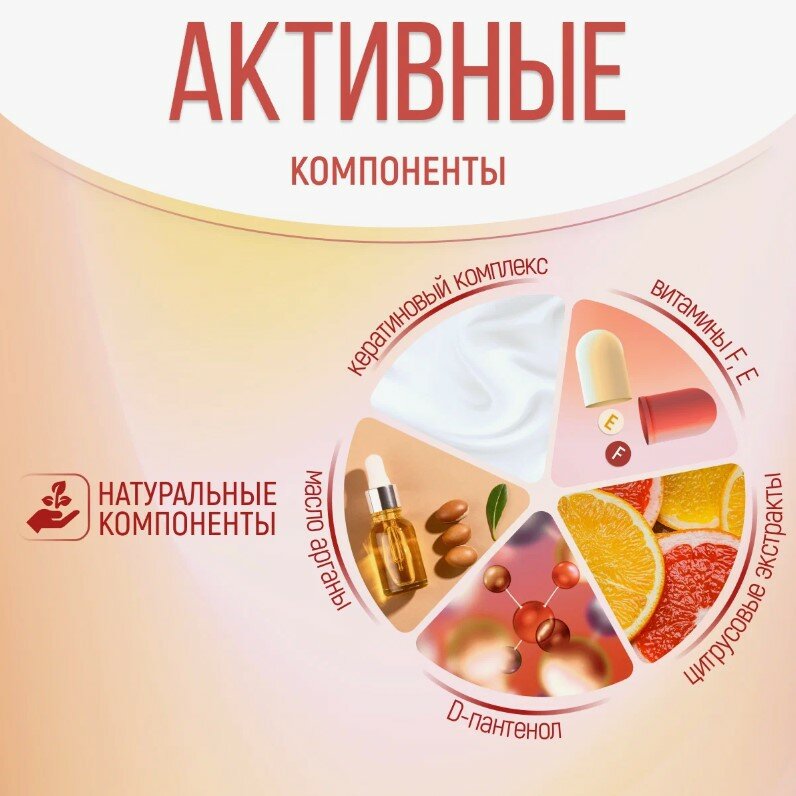 Масло арганы, D-пантенол, комплекс цитрусовых экстрактов, кератин.
