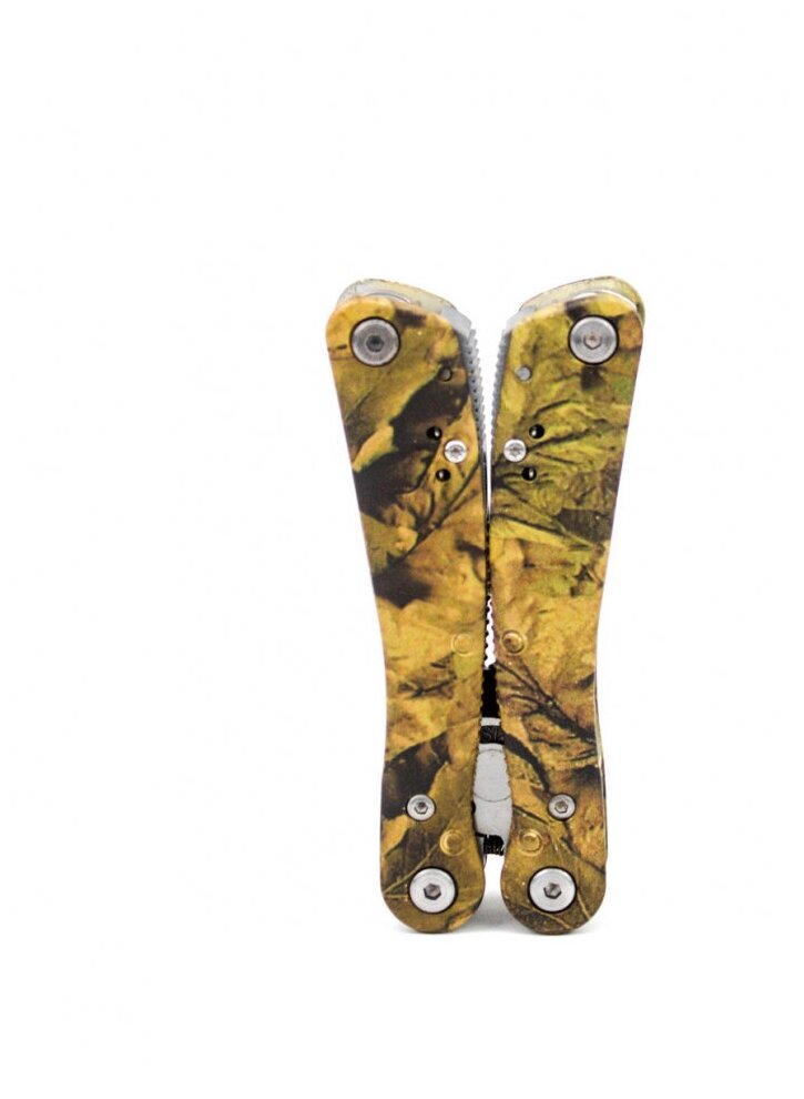 Прекрасный мультитул от компании Ganzo. Дизайн модели рассчитан на охотников, рыбаков и любителей промов в стиле "милитари". На ручках мультитула закреплены пластиковые накладки, имеющие камуфляжную расцветку. В комплекте инструментов мультитула есть: упругие плоскогубцы с кусачками, два лезвия, одно из которых имеет серрейторную заточку, две шлицевые отвертки разного размера, напильник, линейка, удлинитель адаптера для бит, нож для консервов и открывалка для бутылок.