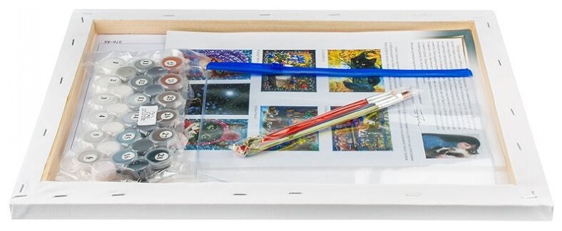 | Комплектация | Холст на подрамнике с пронумерованной схемой, Контрольный лист, Набор акриловых красок, Кисти – 4 шт., Крепление для готовой картины, Пакет с zip-застежкой 23 х 17,5 см., Листовка о художнике |