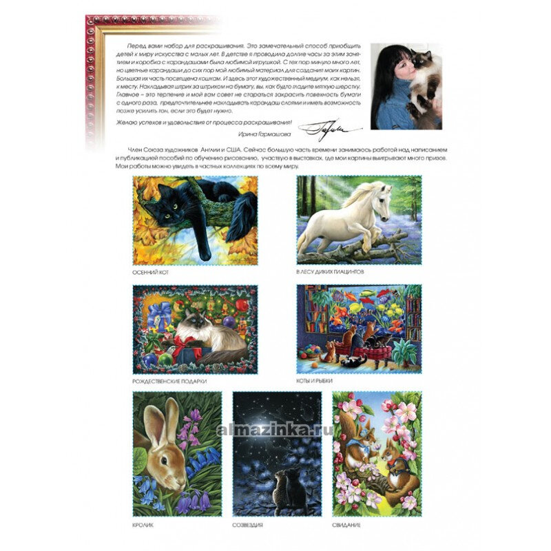 Набор содержит все необходимое для создания картин: холст, натянутый на подрамник, акриловые краски, расфасованные в маленькие баночки, контрольный лист, по которому вы всегда можете свериться в ходе работы и 4 кисточки разной толщины. Раскраска предназначена для детей и взрослых, у этого интересного процесса нет ограничений по возрасту.