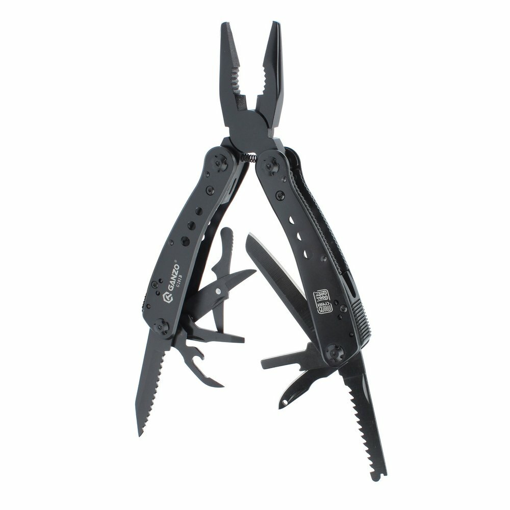 Мультитул Ganzo станет прекрасным приобретением для туриста и просто активного человека. По сути, он представляет из себя настоящую походную мастерскую. В небольшом корпусе инструмента заключается сразу 22 разных элементов, которые помогут справиться с самыми разнообразными поломками и неисправностями. В первую очередь, это плоскогубцы с кусачками. Они сделаны полноразмерными, а потому справятся даже со значительными нагрузками. Остальные же инструменты уменьшены, чтобы их можно было разместить внутри рукояток мультитула. В перечень входят пила, обыкновенный нож и лезвие с волнистой заточкой, ножницы, две отвертки с плоским шлицем разного размера, открывалка. Еще один инструмент — держатель для съемных отверток. Эти элементы собраны в общем органайзере, где находится и магнитный переходник. С их помощью вы легко справитесь с любыми болтами и шурупами.