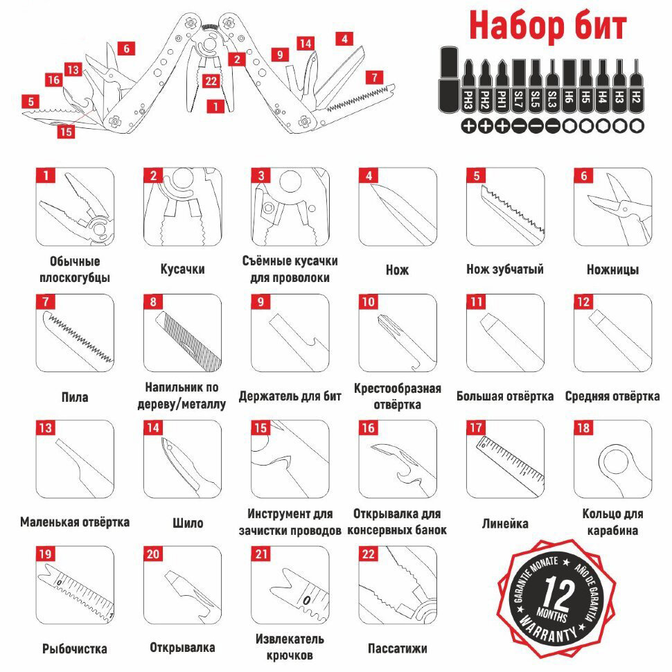 | Функции | Плоскогубцы,кусачки,пила,нож с прямой заточкой,нож с серрейторной заточкой,ножницы,две шлицевые отвертки разного размера,открывалка для бутылок и консервов,держатель для съемных отверток,магнитный переходник,набор бит. |