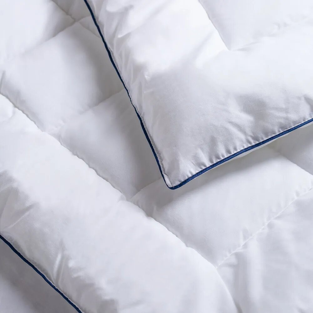 Стёганый чехол с отделкой кантом цвета "Классический синий". Это теплое одеяло плотностью 150 г/кв.м. с оптимальным термобалансом и воздухопроницаемостью.