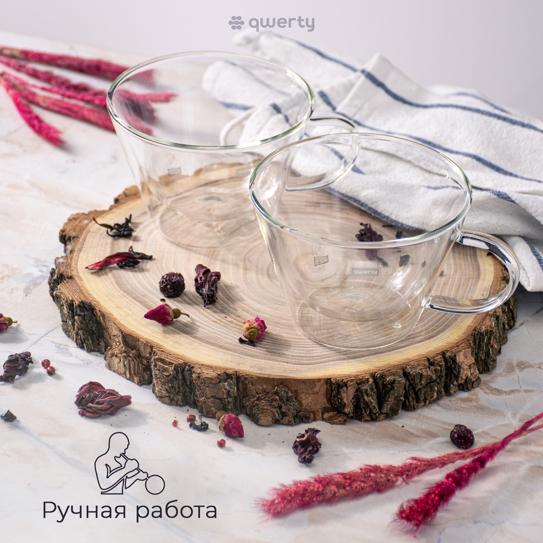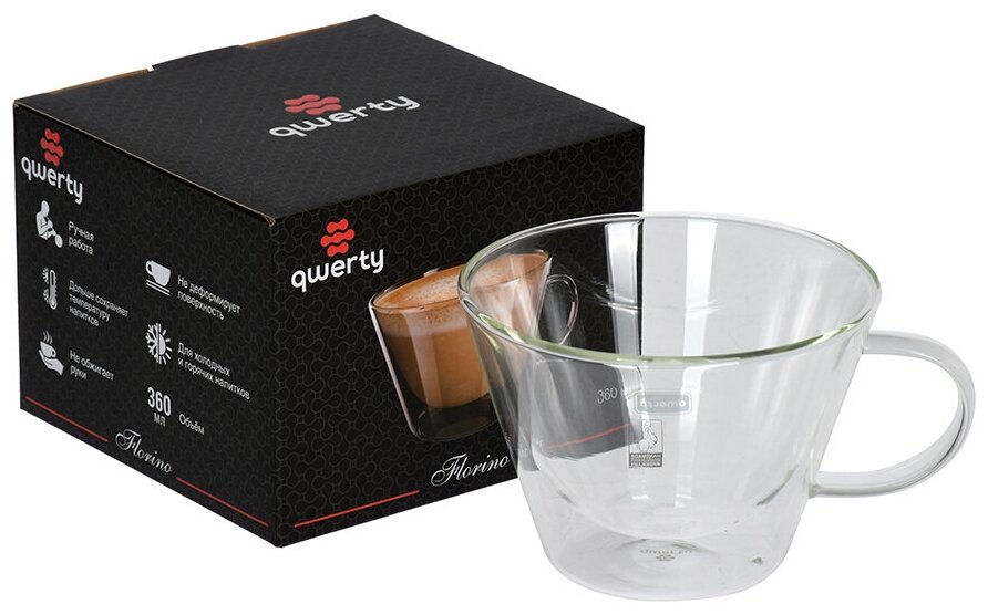 Кружка Qwerty Florino выполнена из термостойкого боросиликатного стекла. Двойная стенка позволяет долго сохранять температуру напитка внутри при этом внешняя поверхность не обжигает руки. Благодаря чему стаканы отлично подходят, как для холодных, так и для горячих напитков. Красота любимых напитков заново раскрывается в стеклянной посуде Qwerty BARISTA. Цветочные чаи, слоистый кофе и яркие коктейли - удивляйте оригинальным вкусом и эффектной подачей. Предупреждение: На дне имеется небольшое запаянное технологическое отверстие (пузырёк размером не более 5 мм), его наличие обусловлено особенностью процесса фабричного производства и не является браком. Рекомендации по уходу: Не использовать в микроволновой печи и посудомоечной машине. Не использовать абразивные чистящие средства. Объем измеряется наливом жидкости до верхнего края сосудаОбъем 360 мл. Кружка стеклянная, ручной работы.
