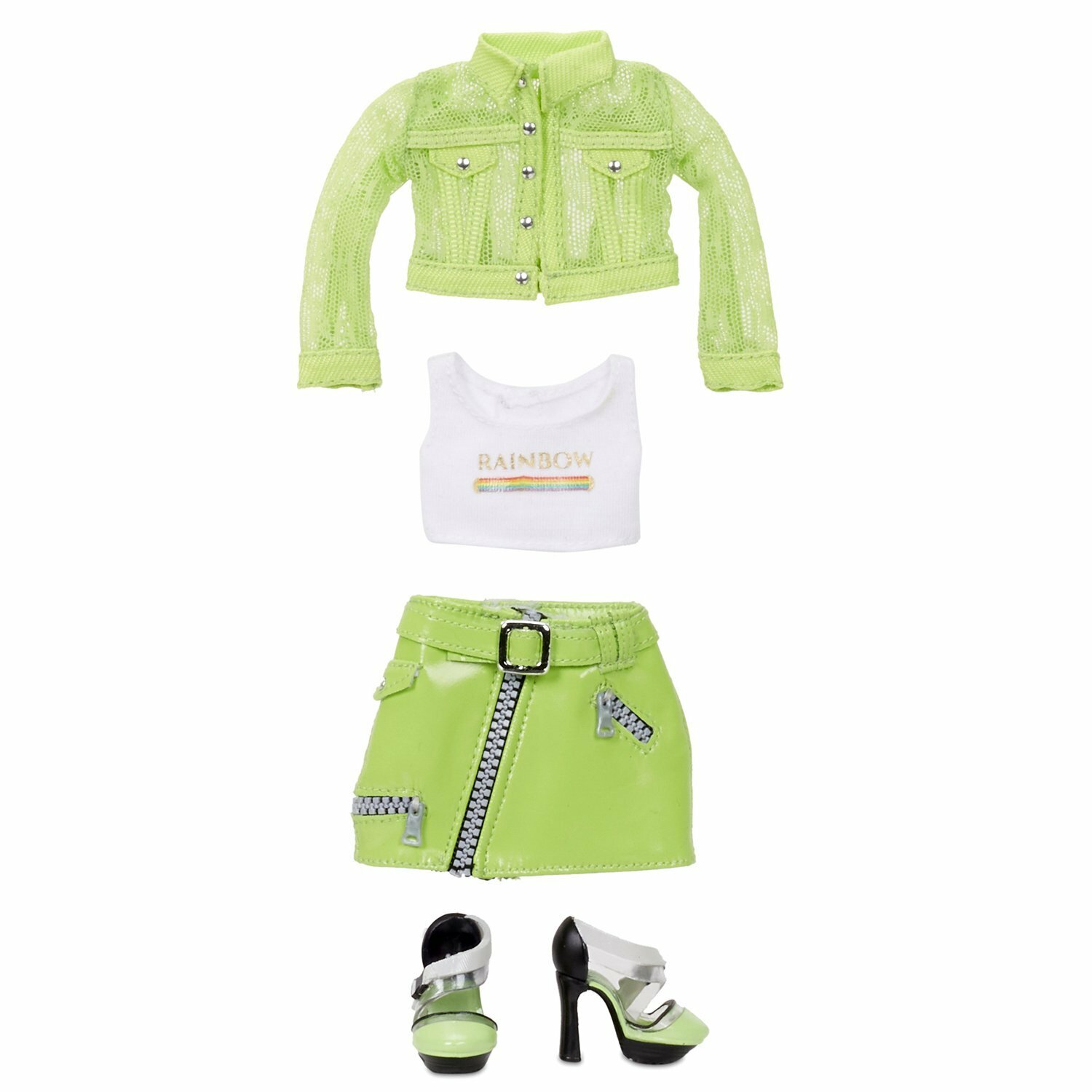 Второй комплект одежды состоит из топа с радужным принтом, кожаной юбки с заклепками и ассиметричной молнией и куртке на кнопках.