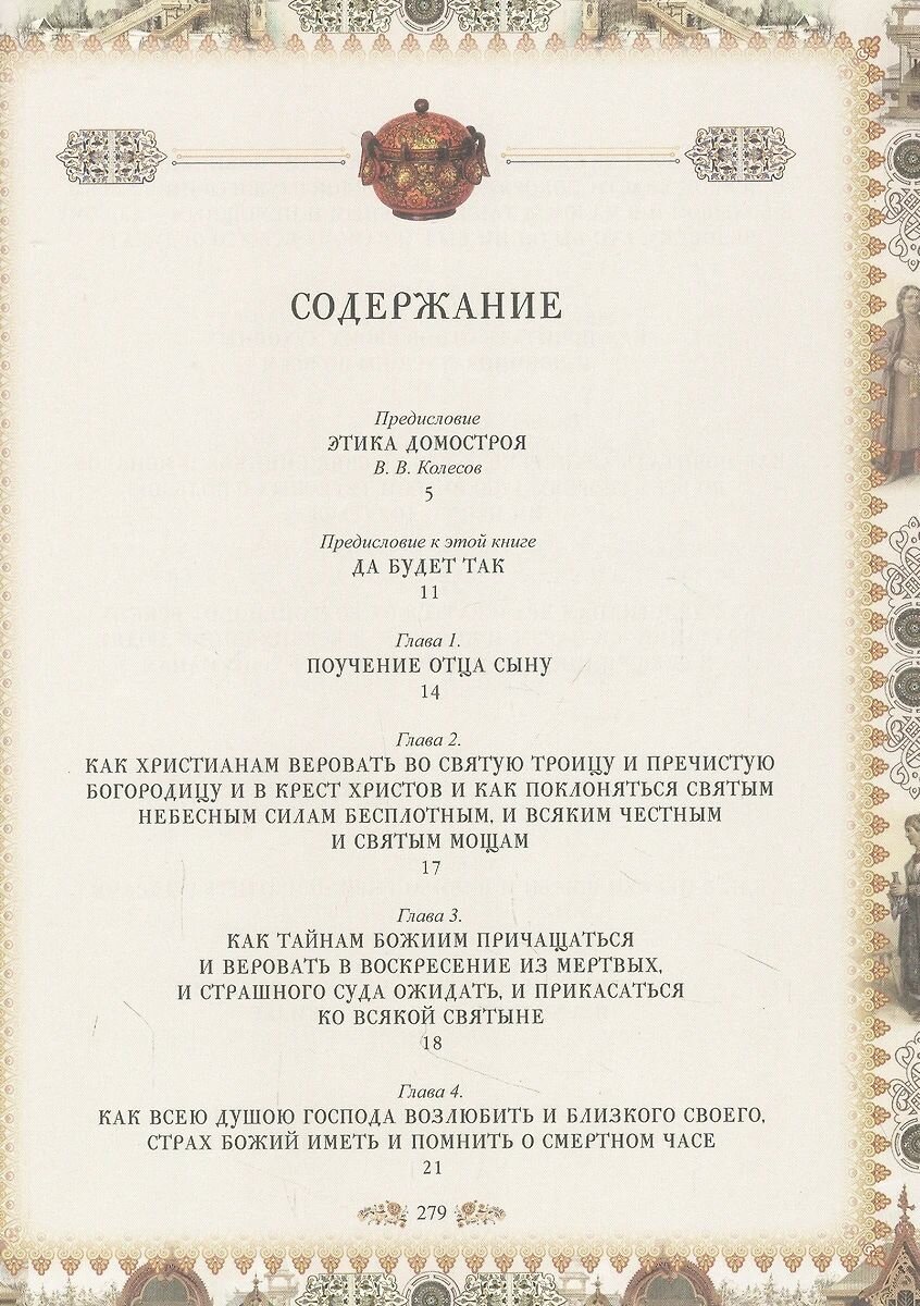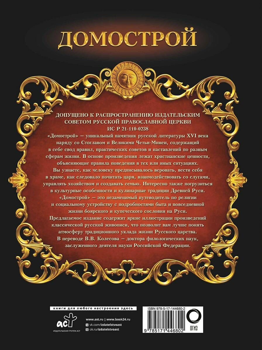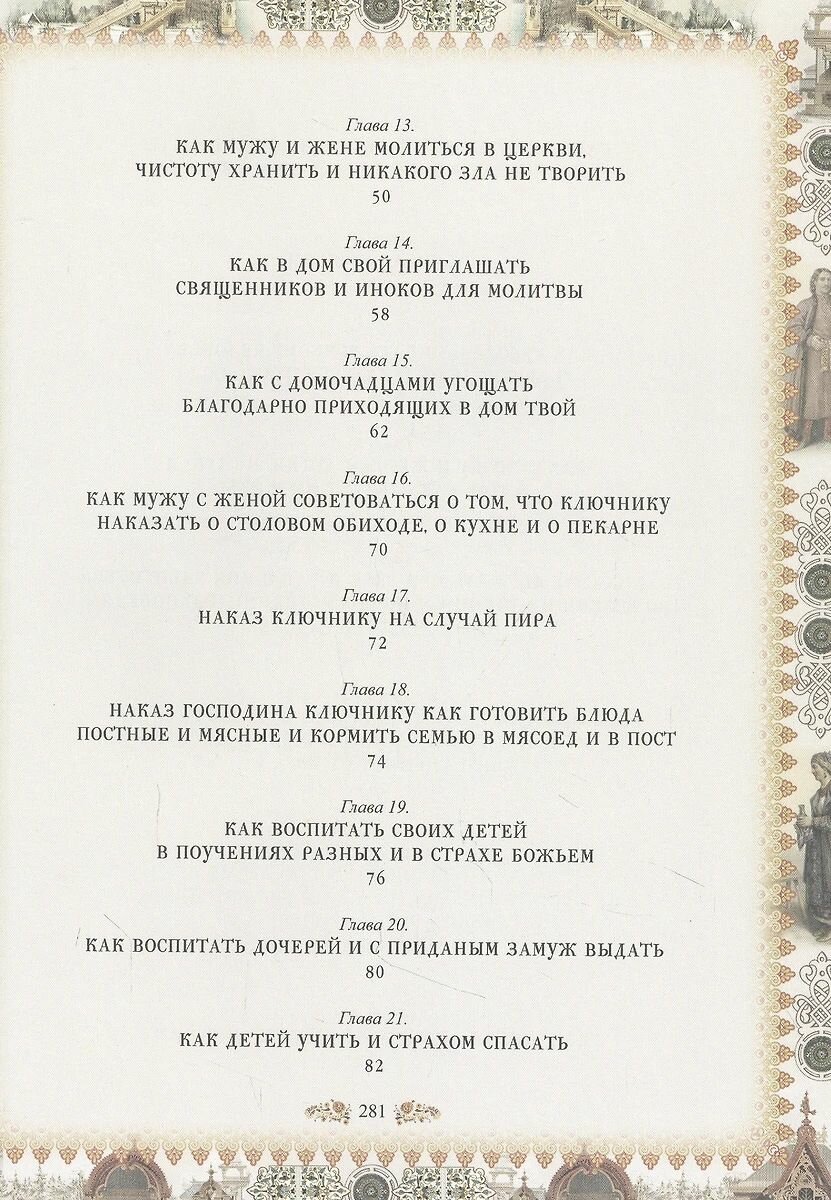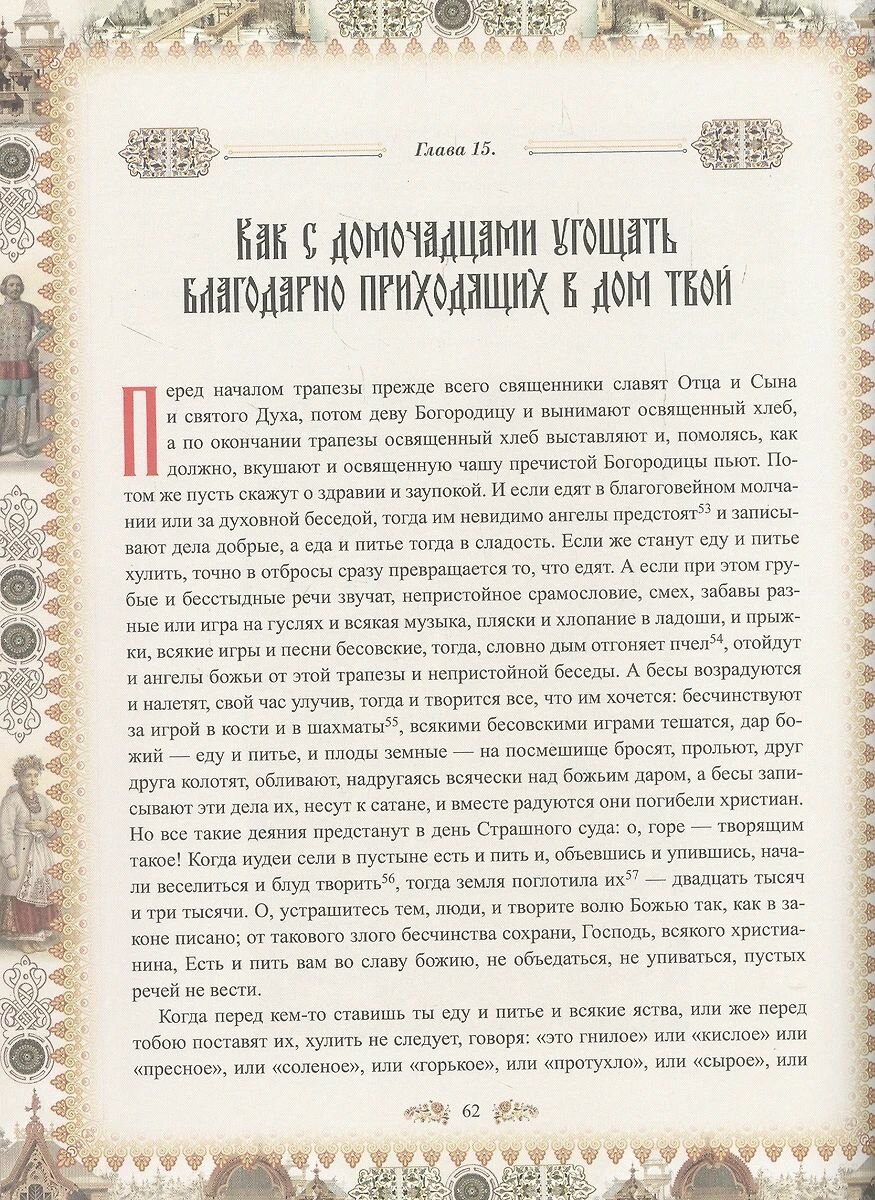 \"Домострой\" в таком шикарно оформленном издании - это не только исторический литературный памятник, но и неповторимый, эффектный, надолго запоминающийся подарок. На юбилей, на свадьбу и т.д. и т.п. С серьёзной же точки зрения книга, действительно, уникальная. Немного существует по миру каких-то подобных книг, которые бы настолько реально, настолько подробно внедрялись в национальный культурный и исторический мир целого народа. Читать \"Домострой\" не очень легко. И разговариваем мы сейчас не так, и пишем не так, и по другому принципу строим фразы и предложения. Но привыкается быстро. Если есть желание прочитать \"Домострой\" без остановки от начала и до конца, вскоре чувствуешь, что всё понимаешь, начинаешь думать во время чтения в таком же стиле, того и гляди, что так же заговоришь. Я себя ловил пару раз на таком желании. Тем не менее, мне показалось, что читать \"Домострой\" по главам будет легче. То есть паузы какие-то по ходу чтения расставлять. Книга, разумеется, дороговата. Я, конечно, был бы очень не против, если бы кто-то из знакомых мне её подарил. Не дождался😢. Сам купил.
