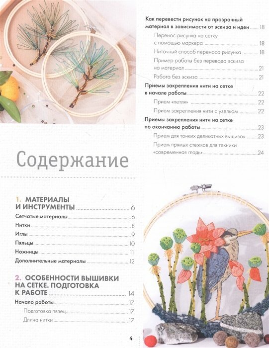 Книга очень подробная, подходит и для начинающих мастериц. В первой главе подробно даны материалы, что важно, дано разъяснение по выбору фатина . Так как не каждый подходит для вышивки. Подробно описано как подготовится к работе. Как можно перенести рисунок. Как тонировать сетку под цвет использованных нитей. Отдельная глава посвящена подбору цвета для будущей работы. Есть описание выполнение швов и стежков, особенности работы на фатине, чтоб не повредить структуру материала. Выделены объёмные швы. Подробно разъяснено как работать с дополнительными материалами: стразовая лента, пайетки, обмотка бусин. Даны техники \"современной глади\": однотонная гладь, градиент цвета. Техника петель. Хаотичная вышивка бисером. Представлены описания как вышить готовые работы: еловая веточка, одуванчик,вышивка венка (это 3-д техника),есть эскиз в оригинальном размере, просто шикарная работа! В венке объяснено как вышить: клубнику, анемоны, васильки, ромашки, роза, цветы земляники,ягоды, астры. бархатцы. Так же дана картина\"В саду\". лотосы, карп и мотылёк. Отдельная глава посвящена оформлению готовой работы.