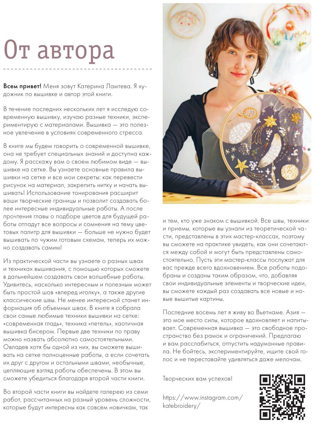 Техника работы с разного вида материалами разобрана в каждом уроке, подробно о стежках и наборах, описано всё от самого первого этапа работы до её окончательного завершения. Книга выполнена в лучших традициях книгопечатания, листы плотные, бумага тяжелая, приятная на ощупь, оформление подарочное, много цветных иллюстраций и профессиональных фотографий, ощущение дорогой книги, внушительная. Рекомендую всем, кто горит идеями и желанием к самовыражению через творчество.