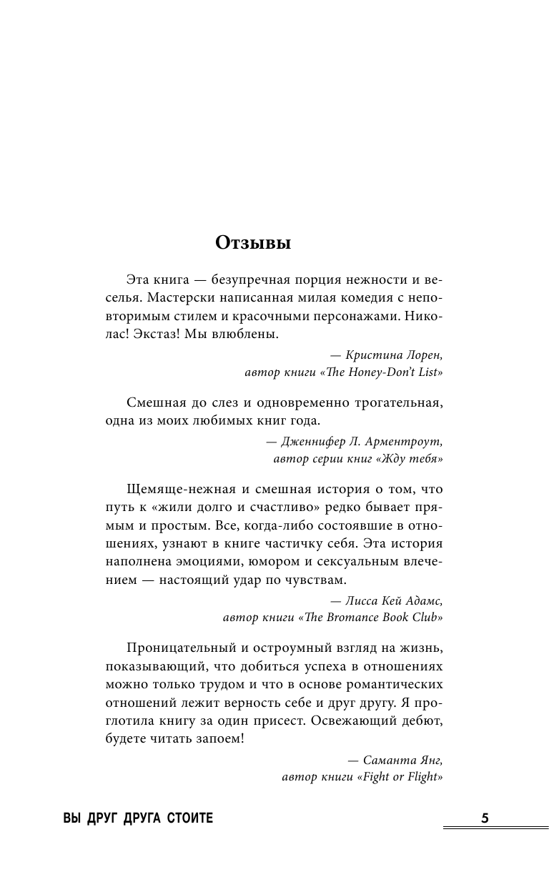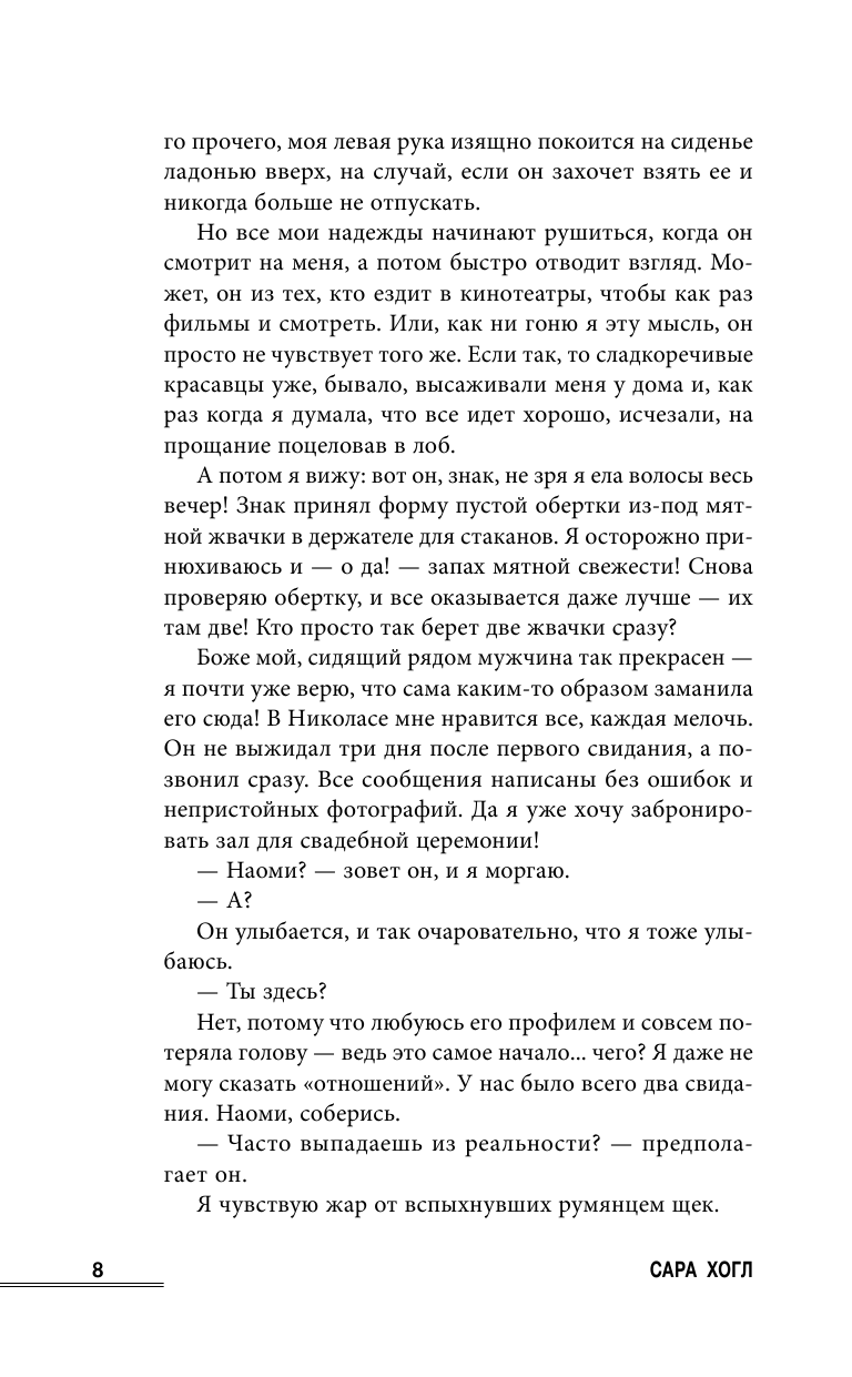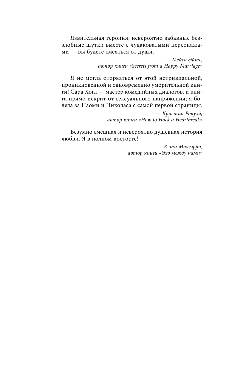 Очаровательная комедия в духе романтических фильмов 1990х-2000х. Но не приторная, что для меня очень важно. Читается легко и совершенно не напрягает. Интересно было следить, как меняется отношение персонажей (больше даже Наоми, от её лица идёт повествование) друг к другу. В общем, книга отлично скрасит вечер, если вам хочется чего-то лёгкого и милого.