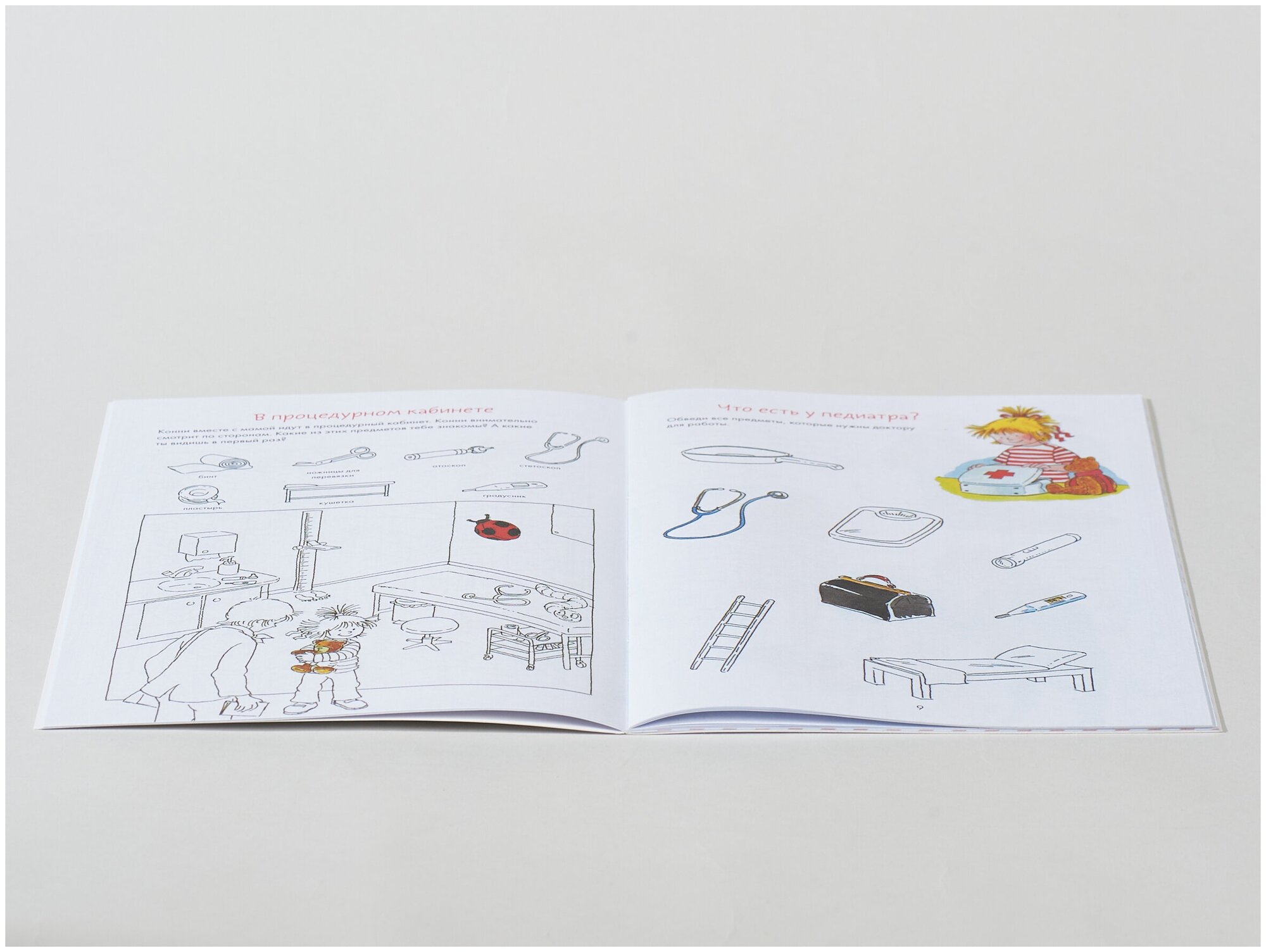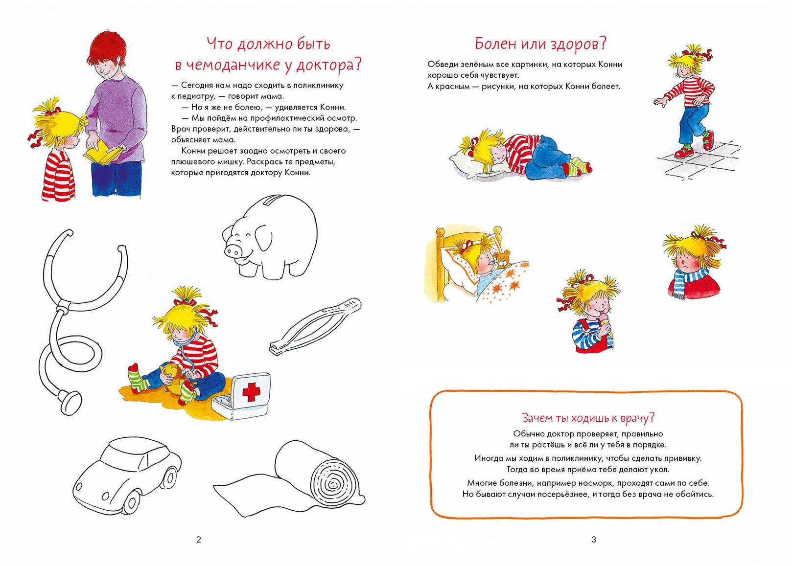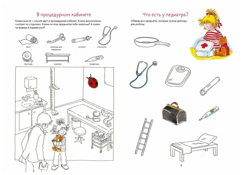Книги с заданиями из серии “Лучший друг — Конни” в игровой форме знакомят детей с окружающим миром, помогают развивать мелкую моторику, тренировать письмо, счет, чтение и приобретать полезные навыки. Вместе с Конни вы легко и просто подготовите ребёнка к визиту в поликлинику. А весёлые задания и игры помогут успокоиться самым подозрительным и мнительным детям. Внутри вы найдёте информацию о том, как проходит приём и осмотр у врача, интересные лабиринты, раскраски и головоломки, игру для тренировки памяти, чек-лист для чистки зубов и заготовку коробочки для молочных зубов. Будьте здоровыми и храбрыми, как любимая героиня! • Поможет подготовить ребенка к осмотру у врача • Весёлые задания на развитие внимательности и логики • Чек-лист чистки зубов и игра-мемори Для кого Для детей от 4 лет. Отзывы Как сделать так, чтобы маленький пациент не боялся и не плакал при посещении врача? Прежде всего нужно создать правильный настрой. Эта занимательная книга поможет малышу обыграть свой страх. Вместе с девочкой Конни он отправится на осмотр к доктору, узнает, чем занимается медсестра, как надо чистить зубы, что такое стетоскоп и многое другое. Выяснив заранее, что ждёт его за дверью кабинета, ребёнок уже не будет бояться. Ведь поход в поликлинику — это повод узнать что-то новое и интересное. Ну а мы, врачи, постараемся оправдать его ожидания и сделать так, чтобы от этих визитов у малыша оставались только положительные впечатления. Ольга Сергеевна Родионова, главный врач СМ-Клиника в 3-м проезде Марьиной Рощи