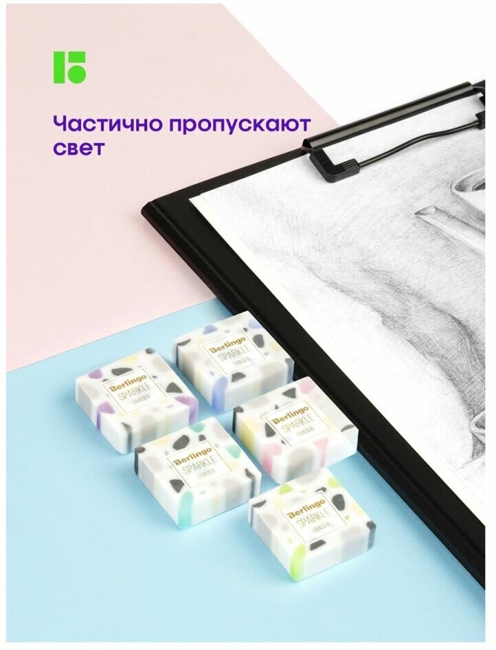 Ластики Berlingo "Sparkle " выполнены из высококачественного пластика. Не токсичны. Прекрасно справляются с линиями от чернографитного карандаша, не оставляют следов и грязных разводов после себя. Не повреждают бумагу. Дизайн выполнен из сочетания плотного и полупрозрачного материала, благодаря чему ластики частично пропускают свет. Кроме того, ластики имеют нежную палитру и необычный дизайн, который напоминает мрамор. Упакованы в PET бокс с европодвесом. 5 цветов ассорти.