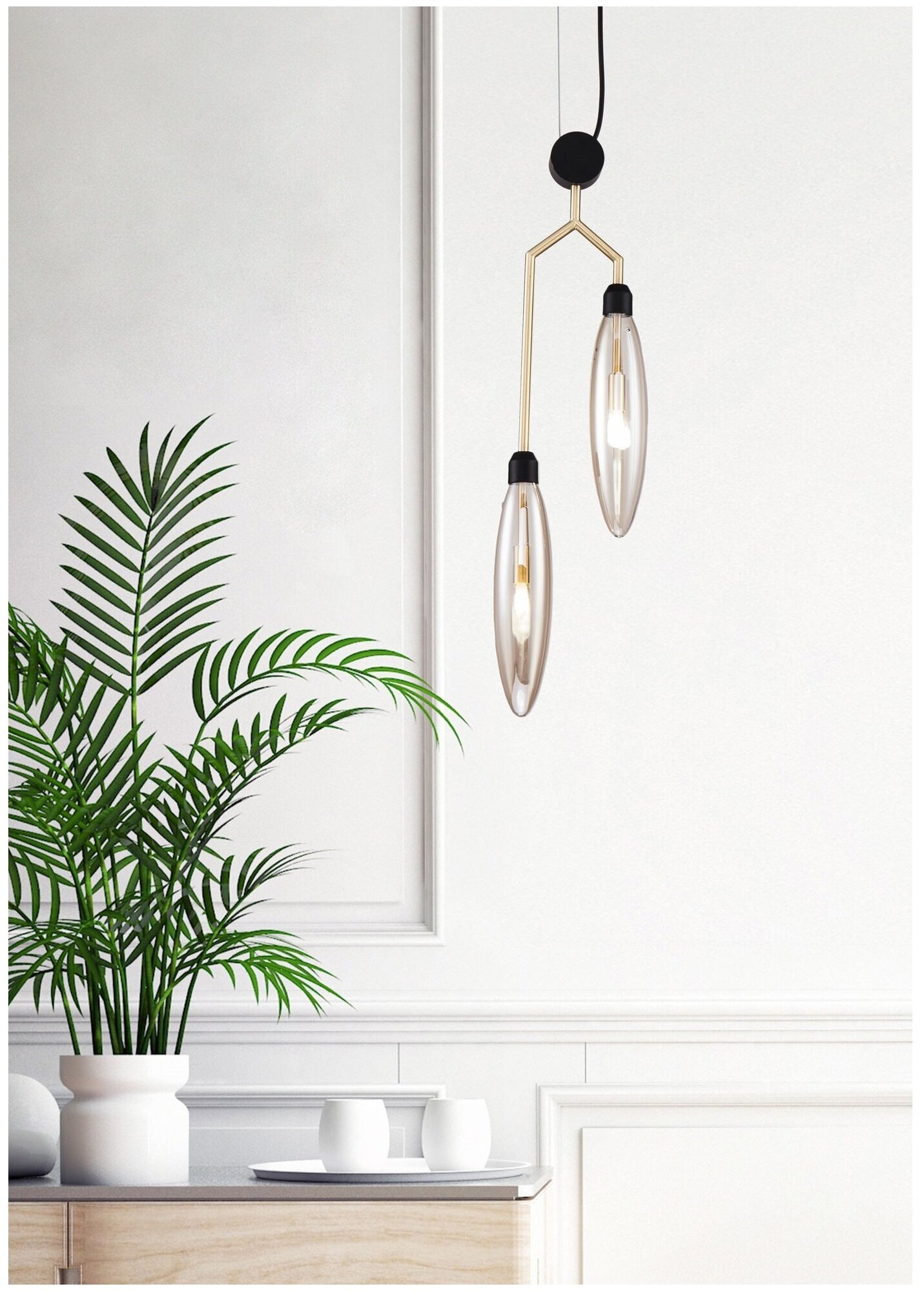 Свой выразительный внешний вид светильники серии приобрели благодаря плафонам необычной вытянутой формы. Сделанные из выдувного стекла с янтарным оттенком, они являются важной деталью конструкции. Арматура изготовлена из золотого матового цвета, а отдельные ее части выкрашены в черный цвет. Высота подвесных светильников регулируется длиной тросов.