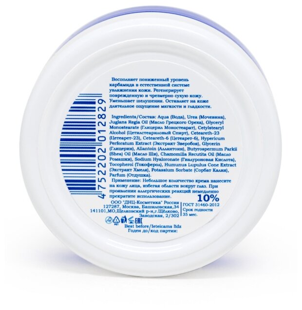 | Состав | Aqua (Вода), Prunus Amygdalus Dulcis Oil (Масло Миндаля), Urea (Мочевина), Glyceryl Monostearate (Глицерил Моностеарат), Cetylstearyl Alcohol (Цетилстеариловый Спирт), Ceteareth-23 (Цетеарет-23), Ceteareth-6 (Цетеарет-6), Chamomilla Recutita Flower Extract (Экстракт Ромашки), Glycerin (Глицерин), Allantoin (Аллантоин), Lanoline (Ланолин), Lavandula Angustifolia Oil (Масло Лаванды), Sodium Hyaloronate (Гиалуроновая Кислота), Tocopherol (Токоферол), Equisetum Arvense Extract (Экстракт Хвоща), Potassium Sorbate (Сорбат Калия), Parfum (Отдушка) |