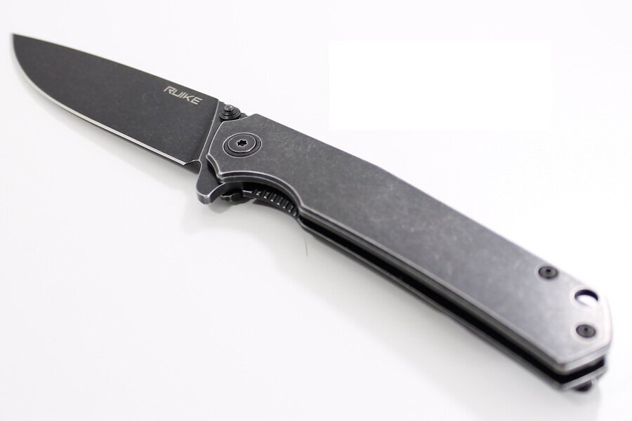 Сталь используется не только для лезвия, но и для рукоятки ножа P801SB. Для данного элемента изготовители взяли марку металла 3Cr14N. Несмотря на то, что этот сплав мягче, он еще лучше защищен от коррозии, что будет важно при использовании ножа в туристических целях. Сталь рукояти подверглась такой же обработке, что и клинок, поэтому нож смотрится очень цельно. Клипса, которая прикручена с одной из сторон ручки P801SB, окрашена в синий цвет, как и шпенек для открытия клинка. Рядом с ней находится небольшой круглое отверстие, предназначенное для крепления темляка. Со стороны клипсы хорошо заметно, что часть рукоятки также играет роль детали для замка, который фиксирует лезвие при открывании ножа. Это замок конструкции Frame lock, известный высокой надежностью и способностью служить в течение долгих лет.