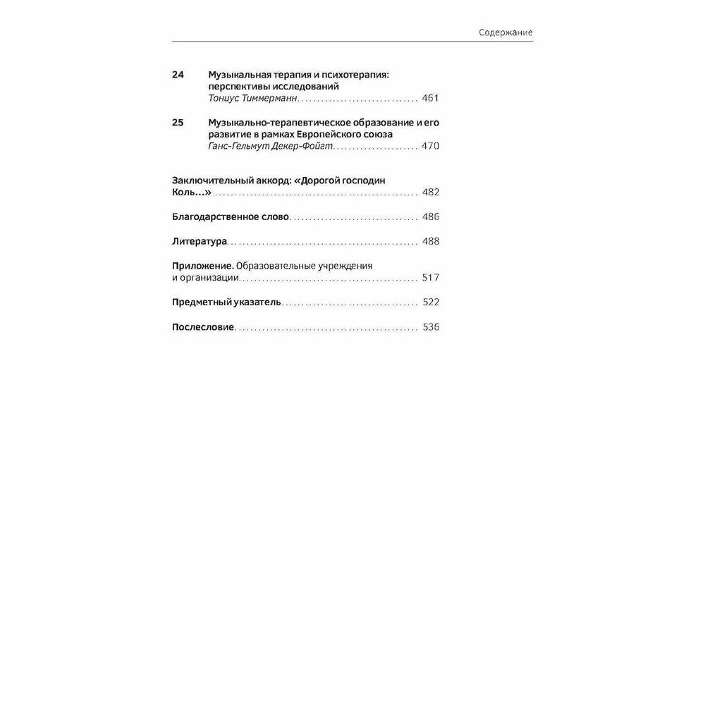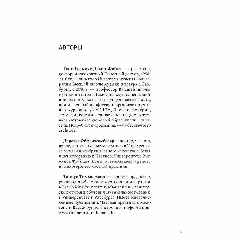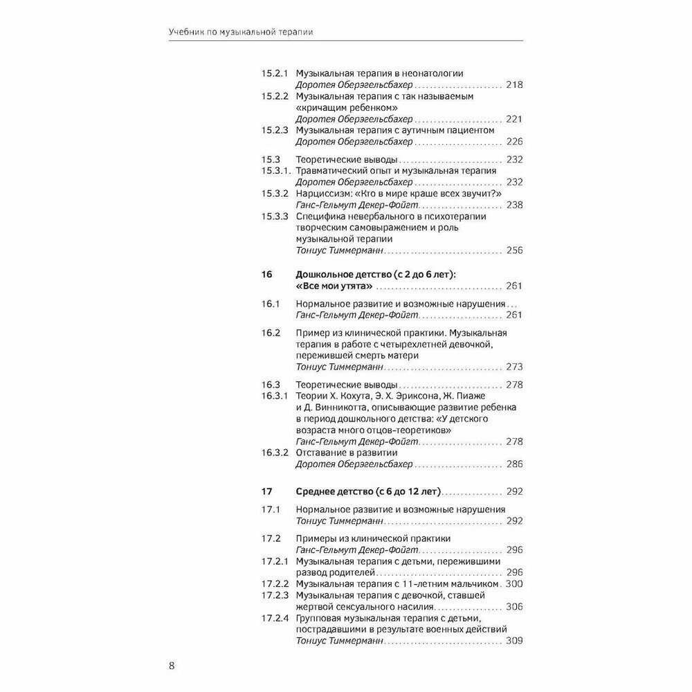 В учебнике представлены теоретические основы музыкальной терапии, описываются различные музыкально-терапевтические техники и способы их применения в клинических условиях. Композиционное построение материала основывается на выявлении роли музыки как терапевтического средства, начиная с исследования звукового пространства во время внутриутробного развития и заканчивая последним периодом жизни человека. Дается разъяснение таким понятиям, как терапевтическая сессия, факторы воздействия, показания и инструментарий. Способы практического использования рассматриваются применительно к различным стадиям возрастного и психологического развития с учетом характерных для того или иного периода нарушений и конфликтов и с привлечением большого количества примеров из практики. В завершение представлены вопросы, связанные с научными исследованиями в области музыкальной терапии и дальнейшими направлениями ее развития, дается краткий обзор образовательных моделей, а также организаций и учреждений, занимающихся музыкальной терапией.
