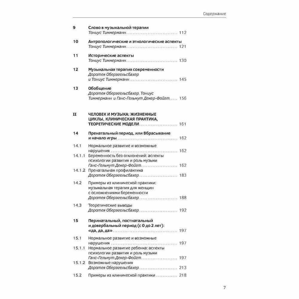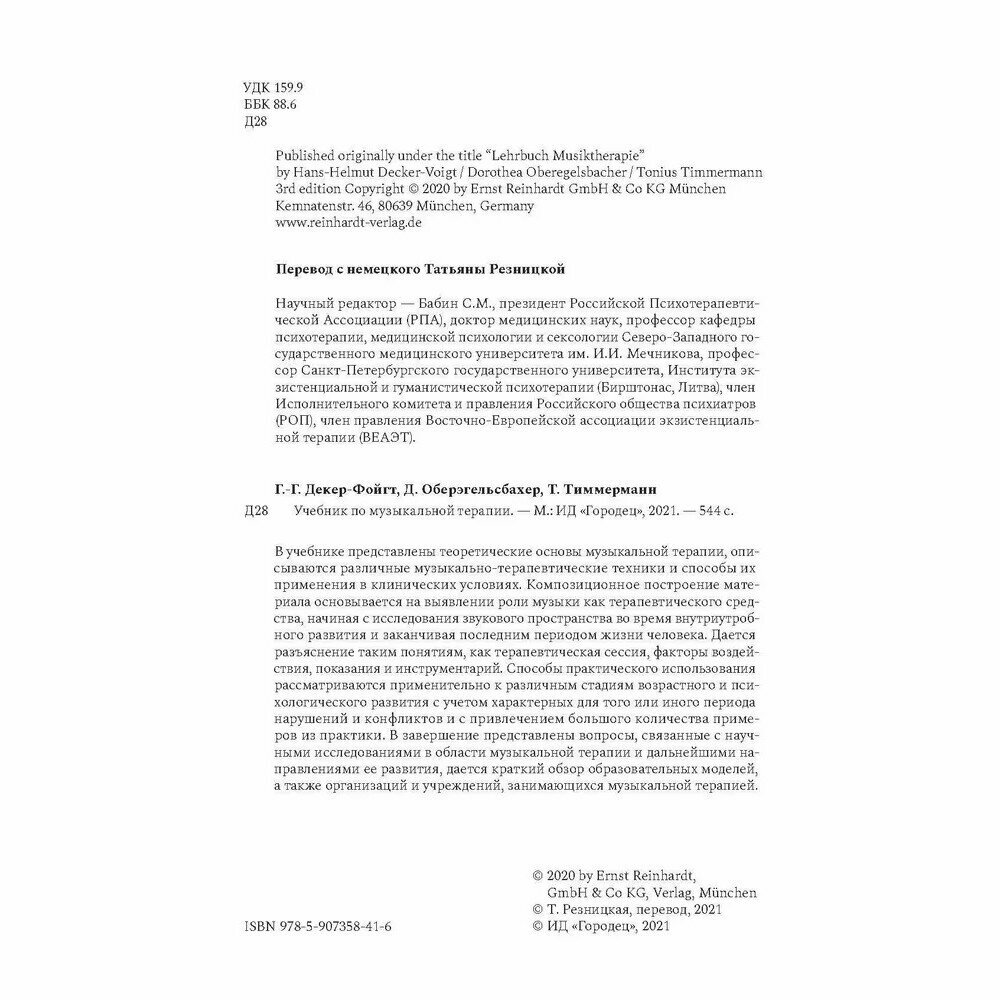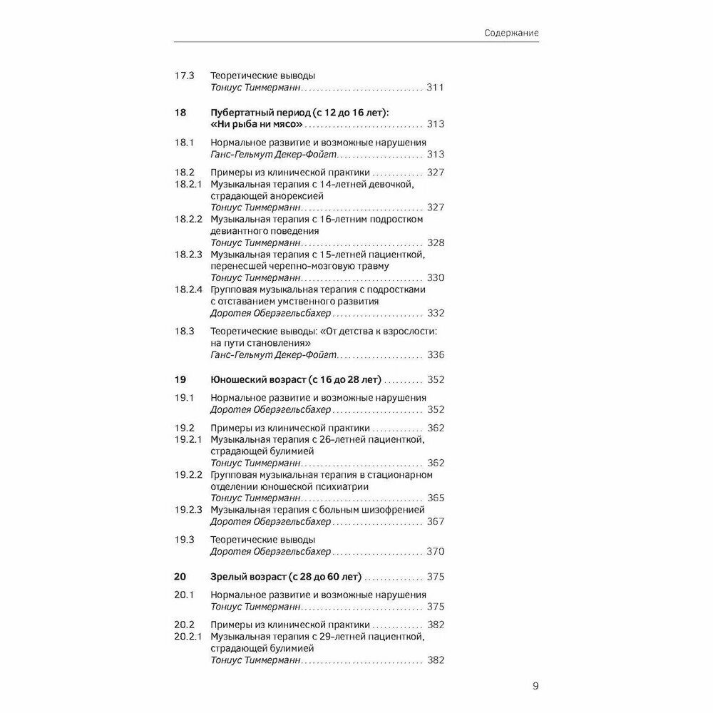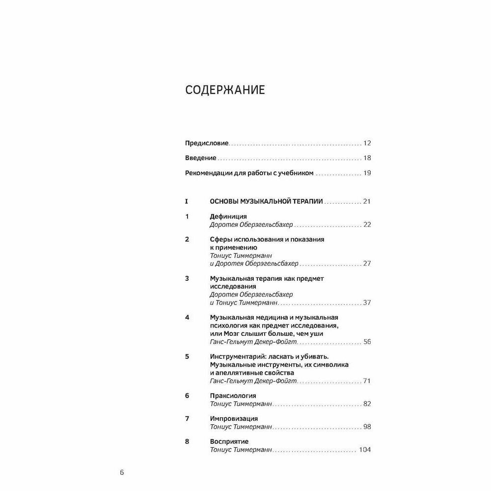 В учебнике представлены теоретические основы музыкальной терапии, описываются различные музыкально-терапевтические техники и способы их применения в клинических условиях. Композиционное построение материала основывается на выявлении роли музыки как терапевтического средства, начиная с исследования звукового пространства во время внутриутробного развития и заканчивая последним периодом жизни человека. Дается разъяснение таким понятиям, как терапевтическая сессия, факторы воздействия, показания и инструментарий. Способы практического использования рассматриваются применительно к различным стадиям возрастного и психологического развития с учетом характерных для того или иного периода нарушений и конфликтов и с привлечением большого количества примеров из практики. В завершение представлены вопросы, связанные с научными исследованиями в области музыкальной терапии и дальнейшими направлениями ее развития, дается краткий обзор образовательных моделей, а также организаций и учреждений, занимающихся музыкальной терапией.