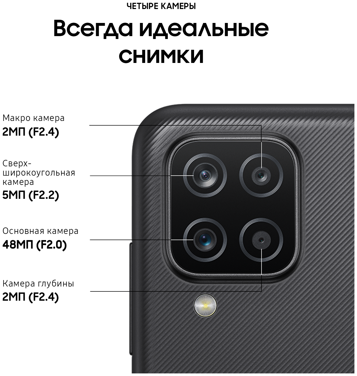 БОЛЬШОЙ И ЯРКИЙ ЭКРАН Большой 6,5-дюймовый HD+ экран с V-образным вырезом для камеры создан для полного погружения в контент. Благодаря поддержке технологии HD+ картинка на Samsung Galaxy A12 яркая и насыщенная. ПРИТЯГАТЕЛЬНЫЙ И ЭРГОНОМИЧНЫЙ ДИЗАЙН Плавные линии и эргономичный дизайн обеспечивают удобное управление и удержание смартфона одной рукой. Samsung Galaxy A12 представлен в трех классических цветах: черном, красном и синем. ЧЕТЫРЕ КАМЕРЫ — ВСЕГДА ИДЕАЛЬНЫЕ СНИМКИ Снимайте памятные моменты на 48-мегапиксельную основную камеру Samsung Galaxy A12. Ультраширокогоульная камера сделает захватывающие панорамные снимки, камера с датчиком глубины сфокусируется на главном, а камера для макросъемки зафиксирует мельчайшие детали и объекты. ФОКУС НА САМОМ ГЛАВНОМ Камера с датчиком глубины позволяет сфокусироваться на главном объекте (люди, животные, любимое блюдо) и получить потрясающий снимок с регулируемым эффектом размытия. ПРЕВОСХОДНЫЕ СЕЛФИ — КАЖДЫЙ РАЗ Фронтальная 8МП камера Samsung Galaxy A12 позволит делать великолепные селфи снимки благодаря специально разработанной функции "Живой фокус", с помощью которой можно красиво размыть изображение фона. МОЩНАЯ БАТАРЕЯ НА ЦЕЛЫЙ ДЕНЬ РАБОТЫ Аккумулятор емкостью 5000 мАч позволит играть, выходить в прямой эфир и обмениваться файлами на протяжении целого дня. А Быстрая Зарядка 15 Вт поможет не выпасть из динамичного ритма твоей жизни. ПРОИЗВОДИТЕЛЬНЫЙ ПРОЦЕССОР Galaxy A12 оснащен быстрым процессором и вместительным хранилищем. Улучшенный 8-ядерный процессор и оперативная память 3/4ГБ обеспечат плавную и эффективную работу любых приложений. Благодаря 32/64 ГБ встроенной памяти и поддержкой microSD карты до 1ТБ можно сохранить еще больше контента. ПРОСТОЙ И УДОБНЫЙ ИНТЕРФЕЙС ONE UI CORE Сконцентрируйтесь на самом важном. Аппаратное и программное обеспечение работают в полной гармонии друг с другом, чтобы вы могли легко и быстро пользоваться контентом и функциями смартфона. "Ночной режим", на который переключается смартфон в вечернее время, позволяет оптимизировать яркость экрана, чтобы обеспечить комфортные условия просмотра контента в темное время суток. НАДЕЖНАЯ СИСТЕМА ЗАЩИТЫ ТЕПЕРЬ ДОСТУПНА КАЖДОМУ Абсолютная безопасность данных с Samsung Knox. Многоуровневая система безопасности Samsung Knox защищает ваши личные данные от вирусов и вредоносных атак как на аппаратном, так и на программном уровне.