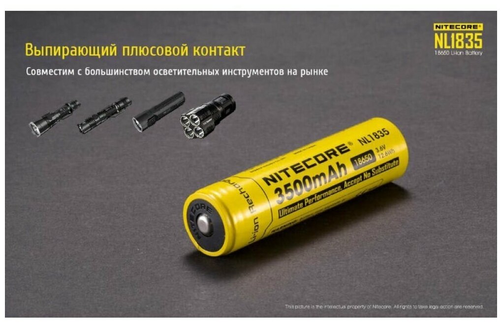 Аккумулятор литиевый Li-Ion 18650 Nitecore NL1835 3.6V (3500mAh), защищенный Компания #NITECOREru представляет качественный литий-ионный аккумулятор с рекордной емкостью 3500mAh! Данный элемент питания продлевает время работы поддерживающих устройств до 60% по сравнению со аналогами.