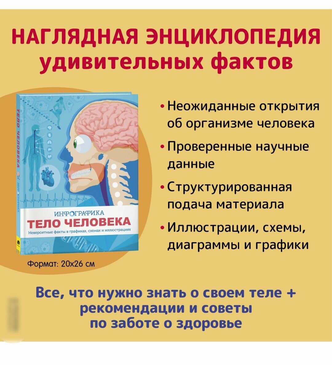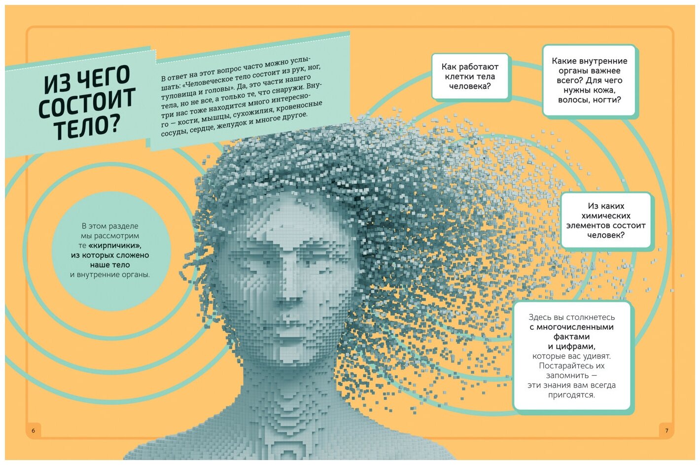 Это самая наглядная энциклопедия о теле человека! Тысячи подробных иллюстраций, схем, диаграмм и графиков, структурированная информация, самые неожиданные факты, сложные процессы, которые мгновенно становятся понятными благодаря продуманным рисункам, – вместе с энциклопедией в инфографике любого читателя ждет множество удивительных открытий. Даже если вы уверены, что знаете все о теле человека, то таким вы его точно никогда не видели! Рассматривайте и моментально запоминайте: как работает мозг и бьется сердце, что происходит в пищеварительной системе, из каких химических элементов состоит человек и как иммунная система сопротивляется инфекциям.