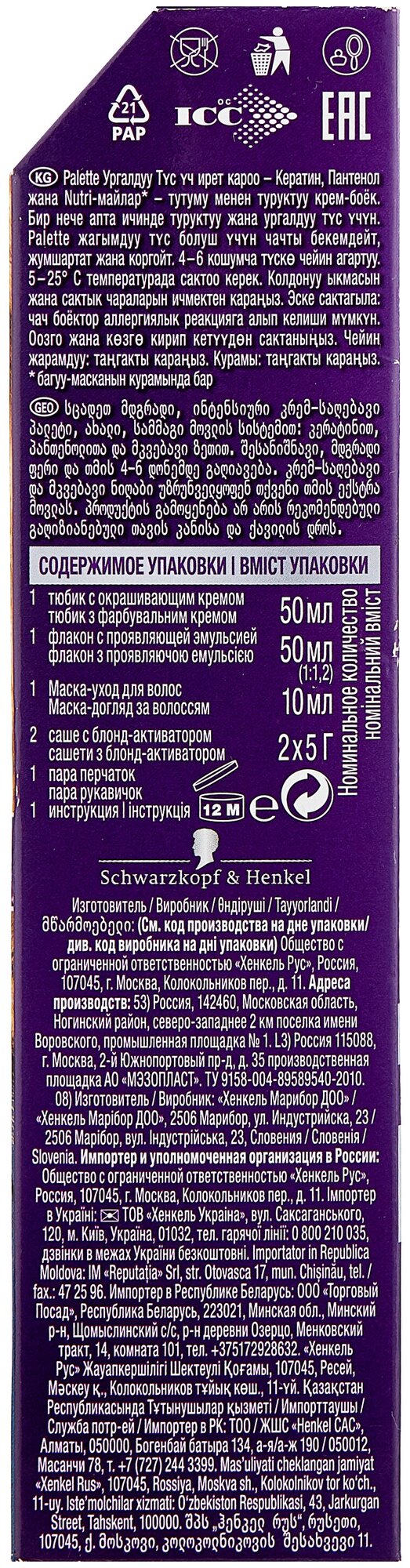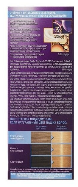 Формула с высокоинтенсивными пигментами проникает глубоко внутрь волоса, защищая цвет от вымывания. Стойкий насыщенный цвет надолго и превосходное закрашивание седины*. Формула и маска-уход с тройной системой ухода с кератином, пантенолом и nutri-маслом обеспечивают бережную заботу о волосах. Palette укрепляет, разглаживает волокна волос и наполняет их цветом для роскошного стойкого оттенка.