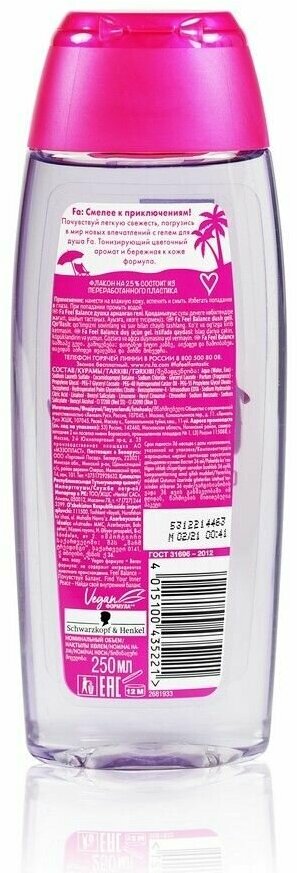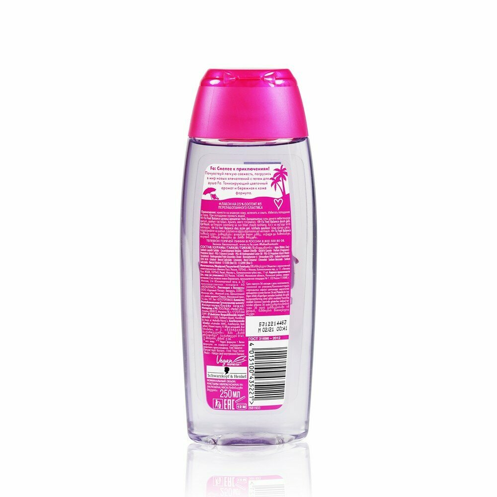 Fa: Смелее к приключениям! Почувствуй легкую свежесть, погрузись в мир новых впечатлений с гелем для душа Fa. Тонизирующий цветочный аромат и бережная к коже формула. 93% ингредиентов натурального происхождения*. Флакон на 25% состоит из переработанного пластика. Бережный уход. Веган формула: не содержит ингредиентов животного происхождения. *вкл. воду.
