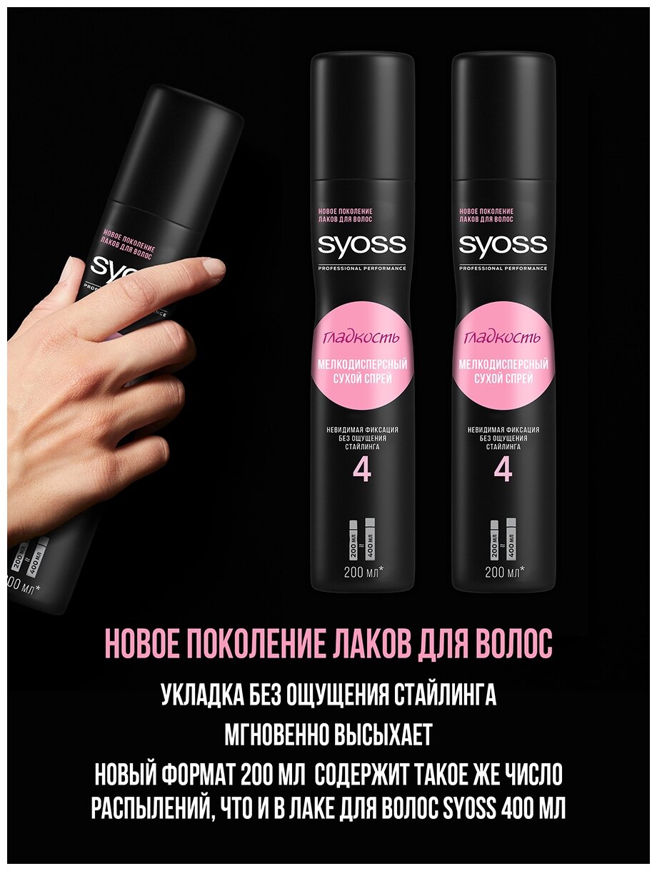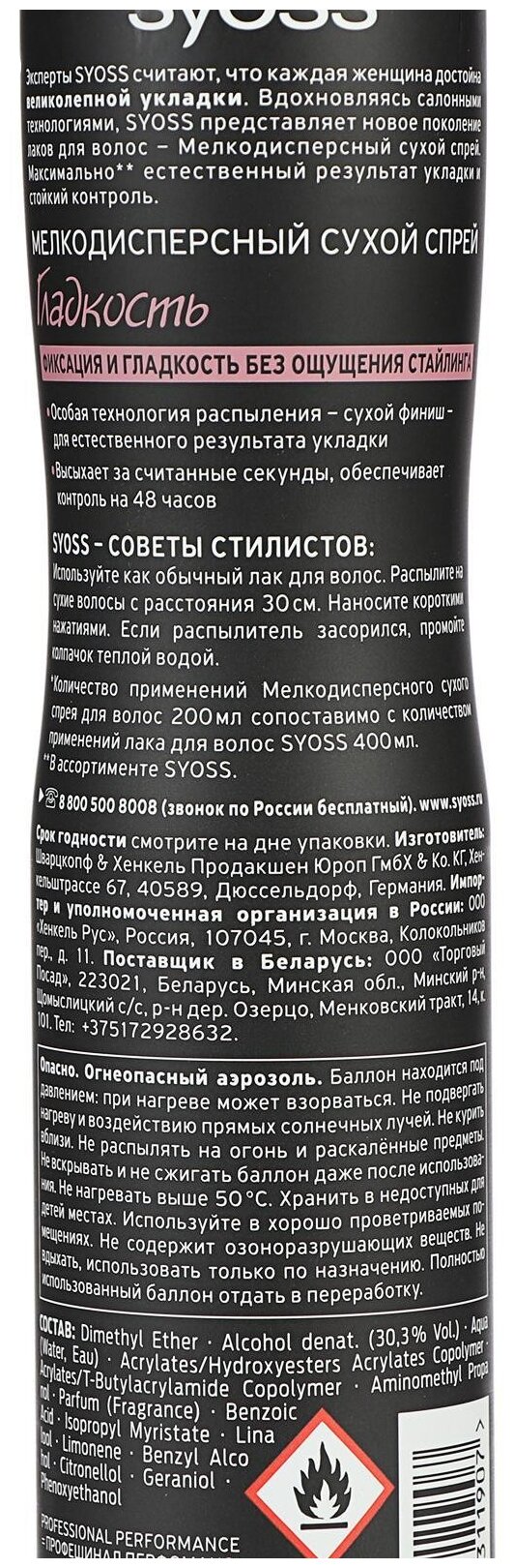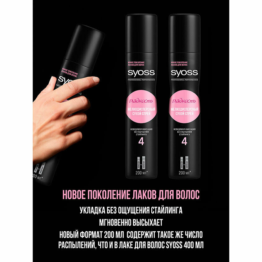 Эксперты Syoss считают, что каждая женщина достойна великолепной укладки. Вдохновляясь салонными технологиями, Syoss представляет новое поколение лаков для волос – Мелкодисперсный сухой спрей. Максимально естественный результат укладки и стойкий контроль. Мелкодисперсный сухой спрей гладкость. Невесомая фиксация и гладкость без ощущения стайлинга.