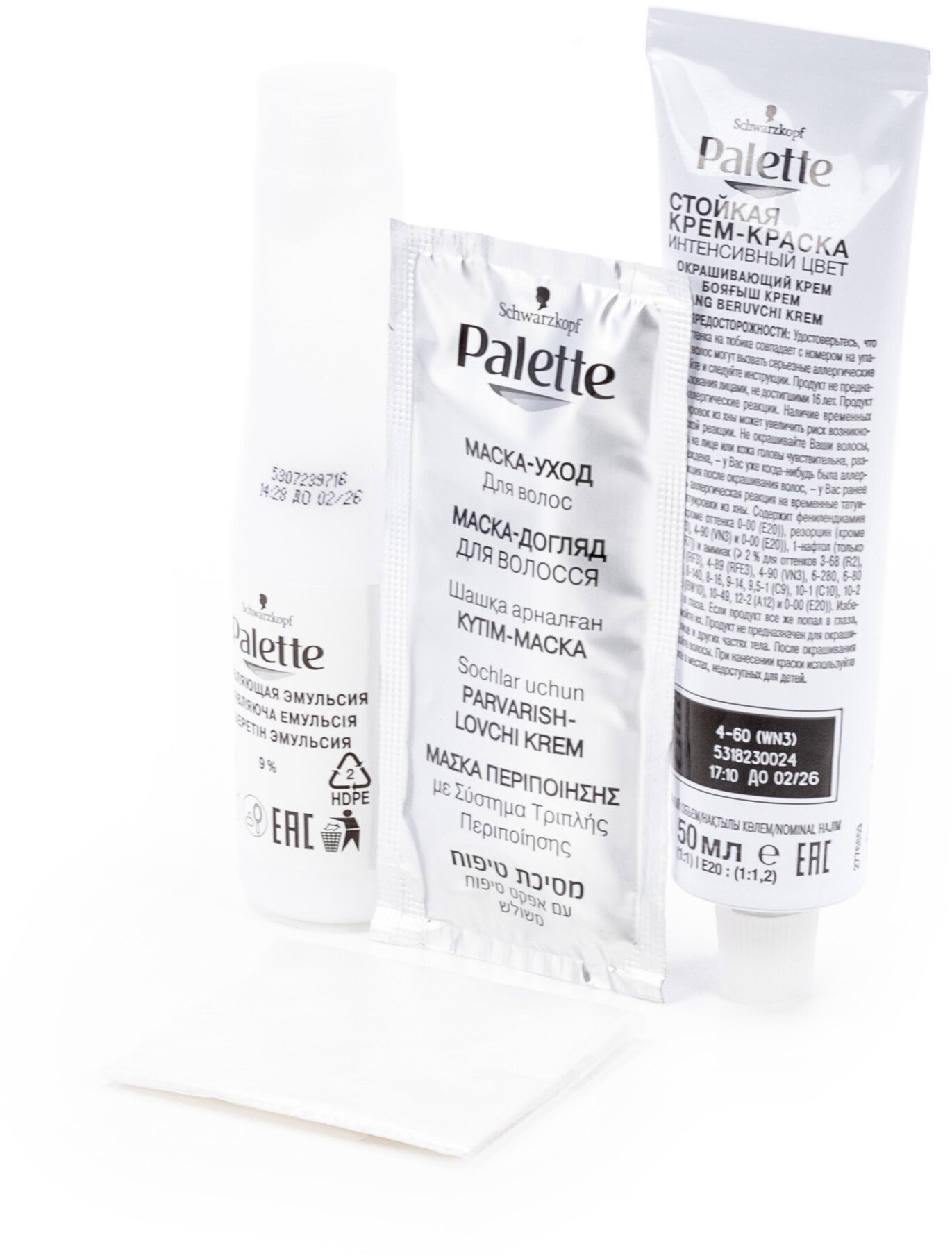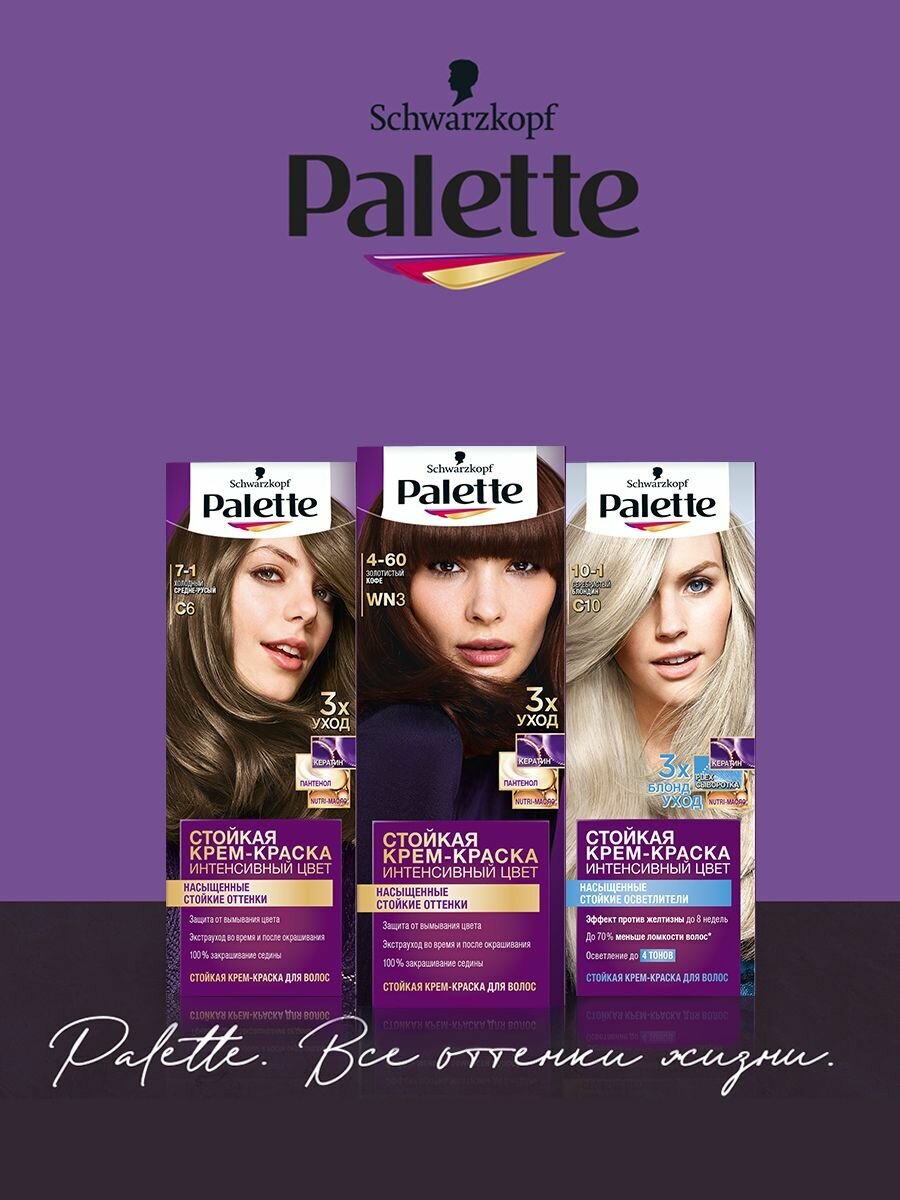 Формула с высокоинтенсивными пигментами проникает глубоко внутрь волоса, защищая цвет от вымывания. Стойкий насыщенный цвет надолго и 100% закрашивание седины. Формула и маска-уход с тройной системой ухода с кератином, пантенолом и nutri-маслом обеспечивают бережную заботу о волосах. Palette укрепляет, разглаживает волокна волос и наполняет их цветом для роскошного стойкого оттенка. Защита от вымывания цвета. Экстрауход во время и после окрашивания. 100% закрашивание седины.