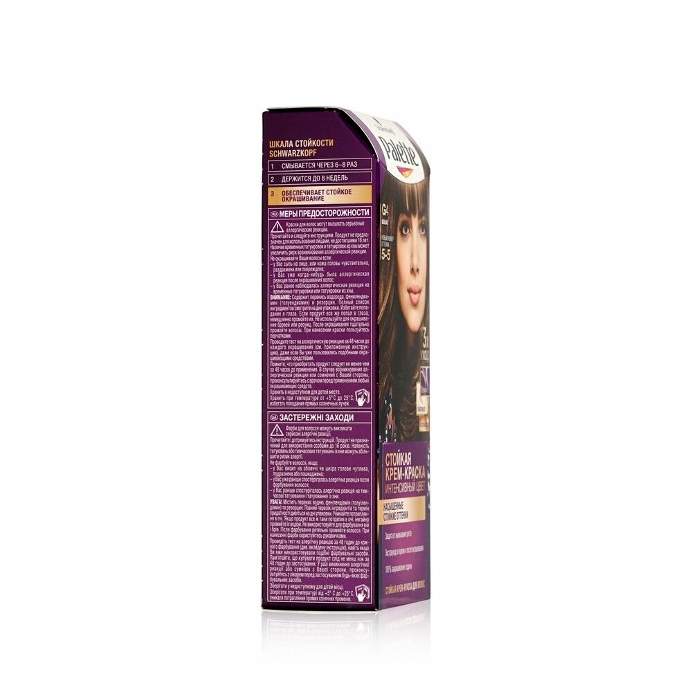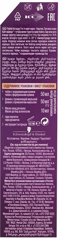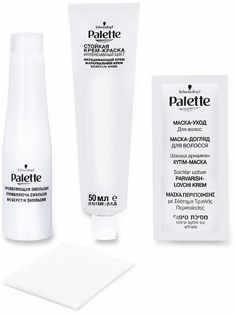 Формула с высокоинтенсивными пигментами проникает глубоко внутрь волоса, защищая цвет от вымывания. Стойкий насыщенный цвет надолго и 100% закрашивание седины. Формула и маска-уход с тройной системой ухода с кератином, пантенолом и nutri-маслом обеспечивают бережную заботу о волосах. Palette укрепляет, разглаживает волокна волос и наполняет их цветом для роскошного стойкого оттенка.