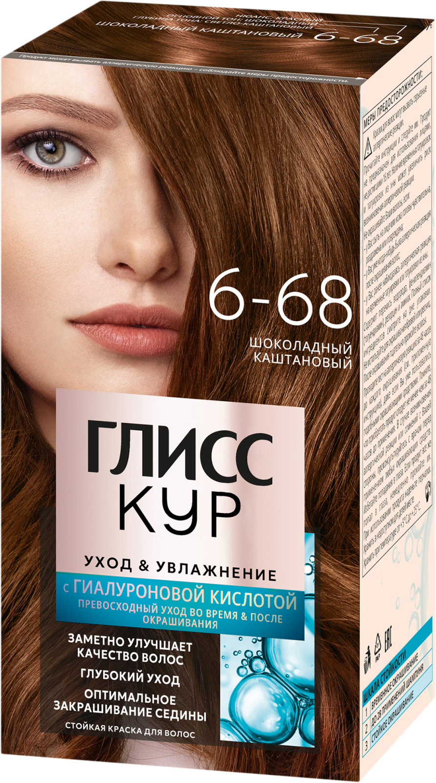 Стойкая краска для волос Gliss Kur Уход & Увлажнение с гиалуроновой кислотой 6-68 Шоколадный каштановый. Превосходный уход во время и после окрашивания.