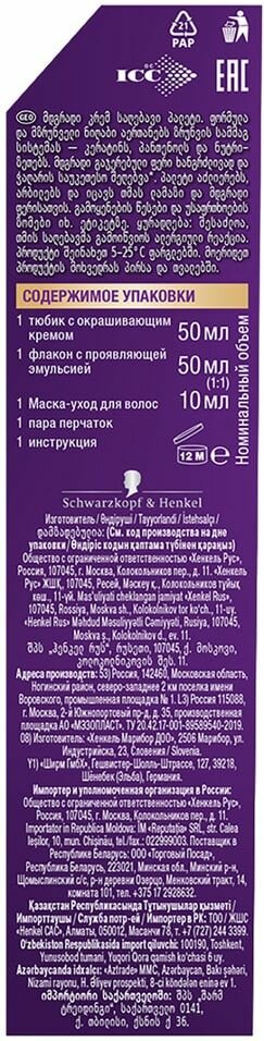 | Состав набора | 1 флакон с эмульсией проявителем, 1 тюбик с крем-краской, 1 маска-уход, 1 пара одноразовых перчаток, 1 инструкция |