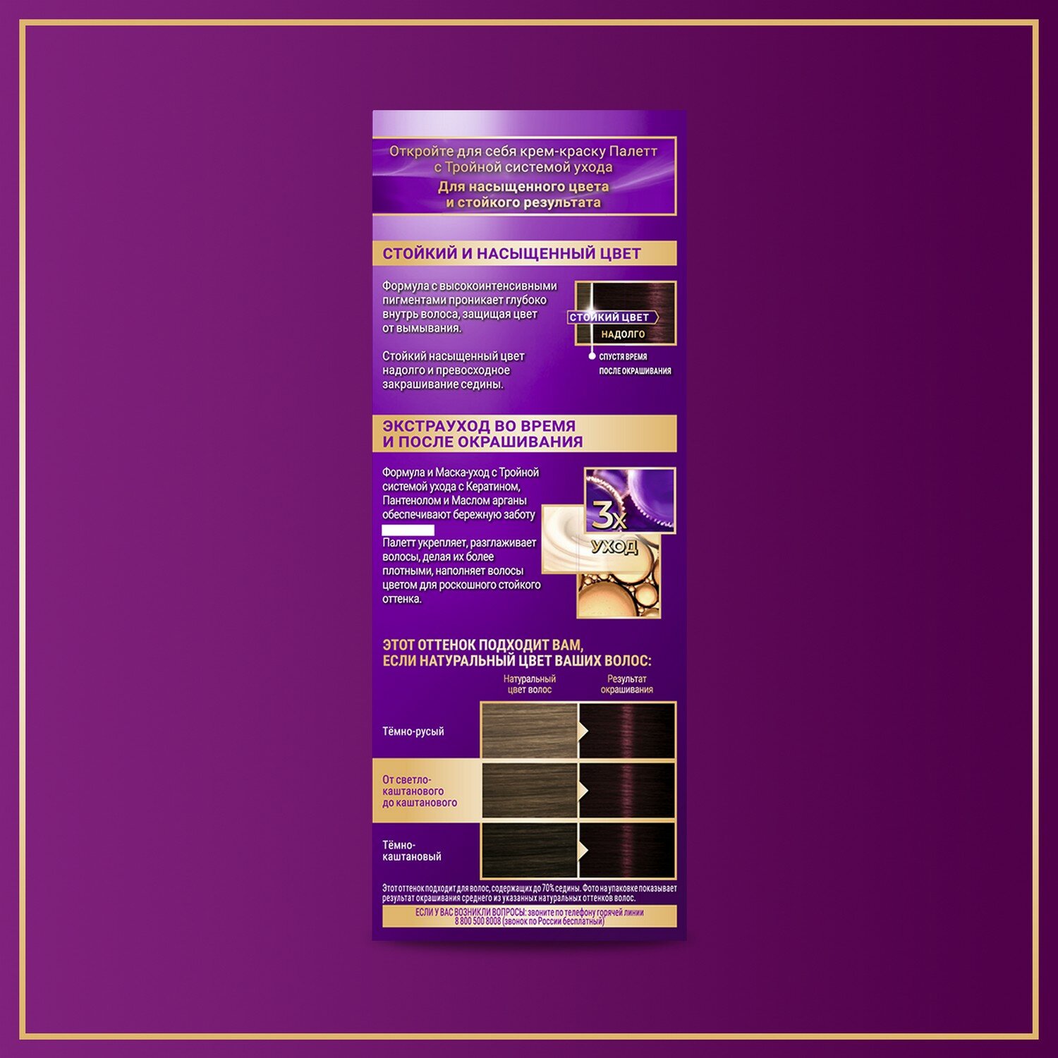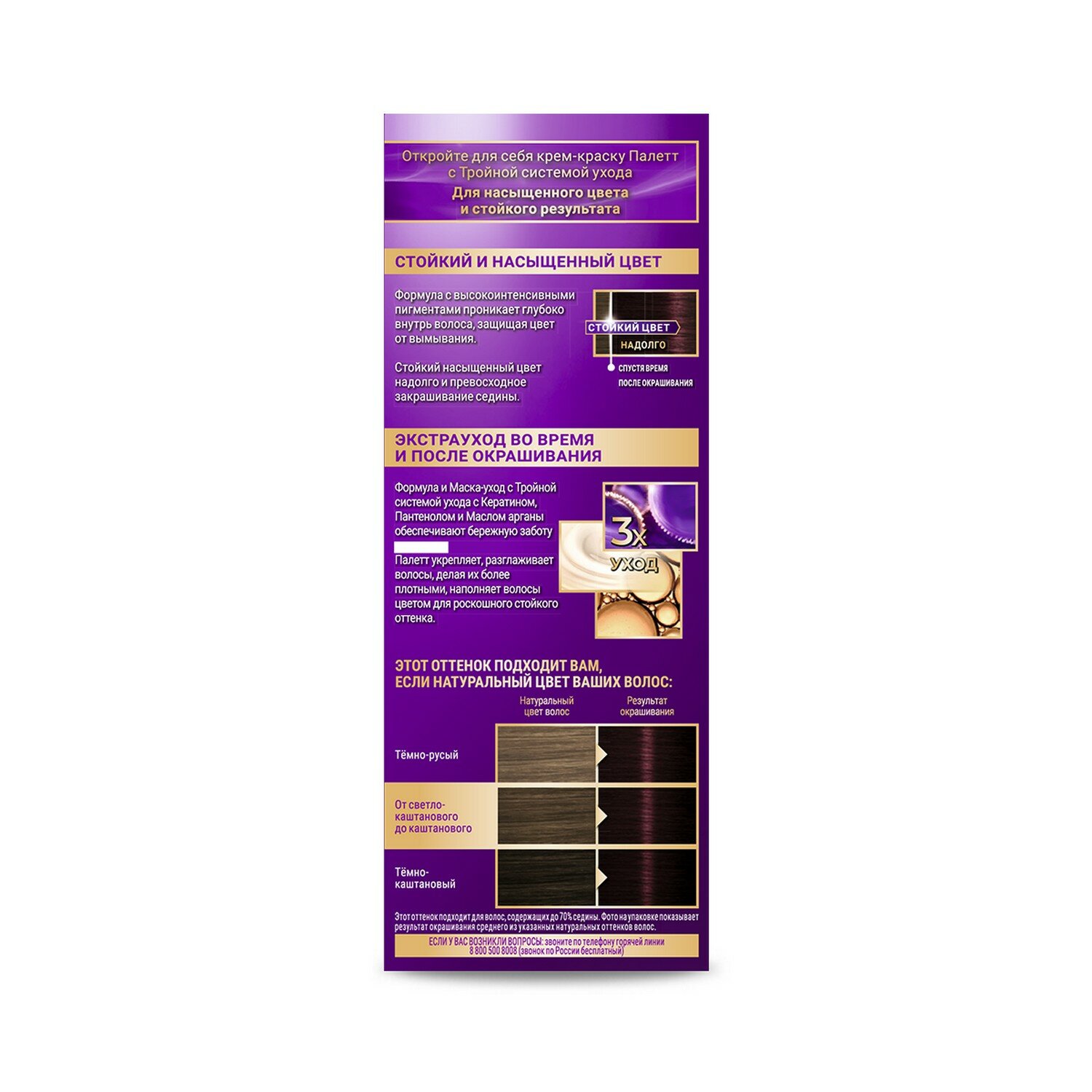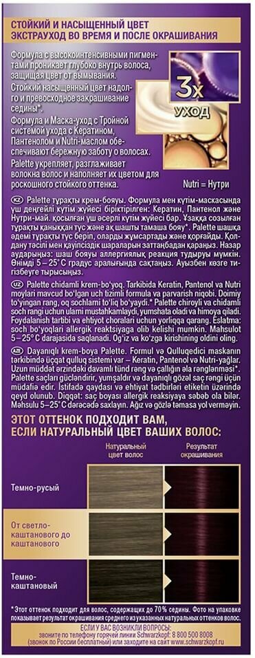 Формула с высокоинтенсивными пигментами проникает глубоко внутрь волоса, защищая цвет от вымывания. Стойкий насыщенный цвет надолго и превосходное закрашивание седины*. Формула и маска-уход с тройной системой ухода с кератином, пантенолом и nutri-маслом обеспечивают бережную заботу о волосах. Palette укрепляет, разглаживает волокна волос и наполняет их цветом для роскошного стойкого оттенка. Защита от вымывания цвета. Экстрауход во время и после окрашивания. Превосходное закрашивание седины*. * Этот оттенок подходит для волос, содержащих до 70% седины. Nutri = Нутри