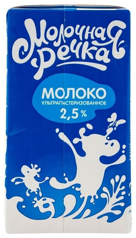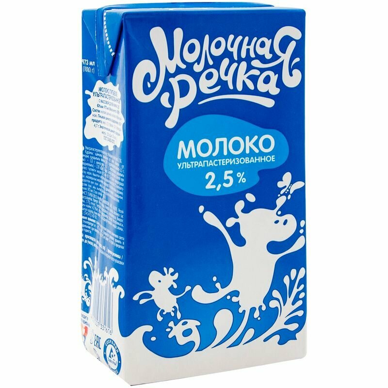 Молоко ?Молочная Речка? ультрапастеризованное 2.5% 973 г - замечательное, настоящее молоко с приятным, сладковатым вкусом, знакомым с самого детства. Это отличный напиток для ежедневного употребления в самостоятельном виде, а также для приготовления густых молочных каш, ароматного какао, всевозможной выпечки и воздушного омлета. Оно отлично подойдет для добавления в чай и кофе, для приготовления молочных коктейлей и интересных десертов. В производстве молока ?Молочная Речка? используется тольконатуральное, качественное сырье. Современные технологии ультрапастеризации способствуют тщательной очистке молока с сохранением вкуса, пользы и витаминно-минерального состава. Такое молоко имеет прекрасный, настоящий вкус и увеличенный срок хранения. Стакан молока с булочкой, горбушкой хлеба или румяным печеньем станет источником кальция и других необходимых веществ, зарядит энергией, наполнит силами и подарит отличное настроение большим и маленьким поклонникам природного напитка. Молоко ?Молочная речка? радует своих по