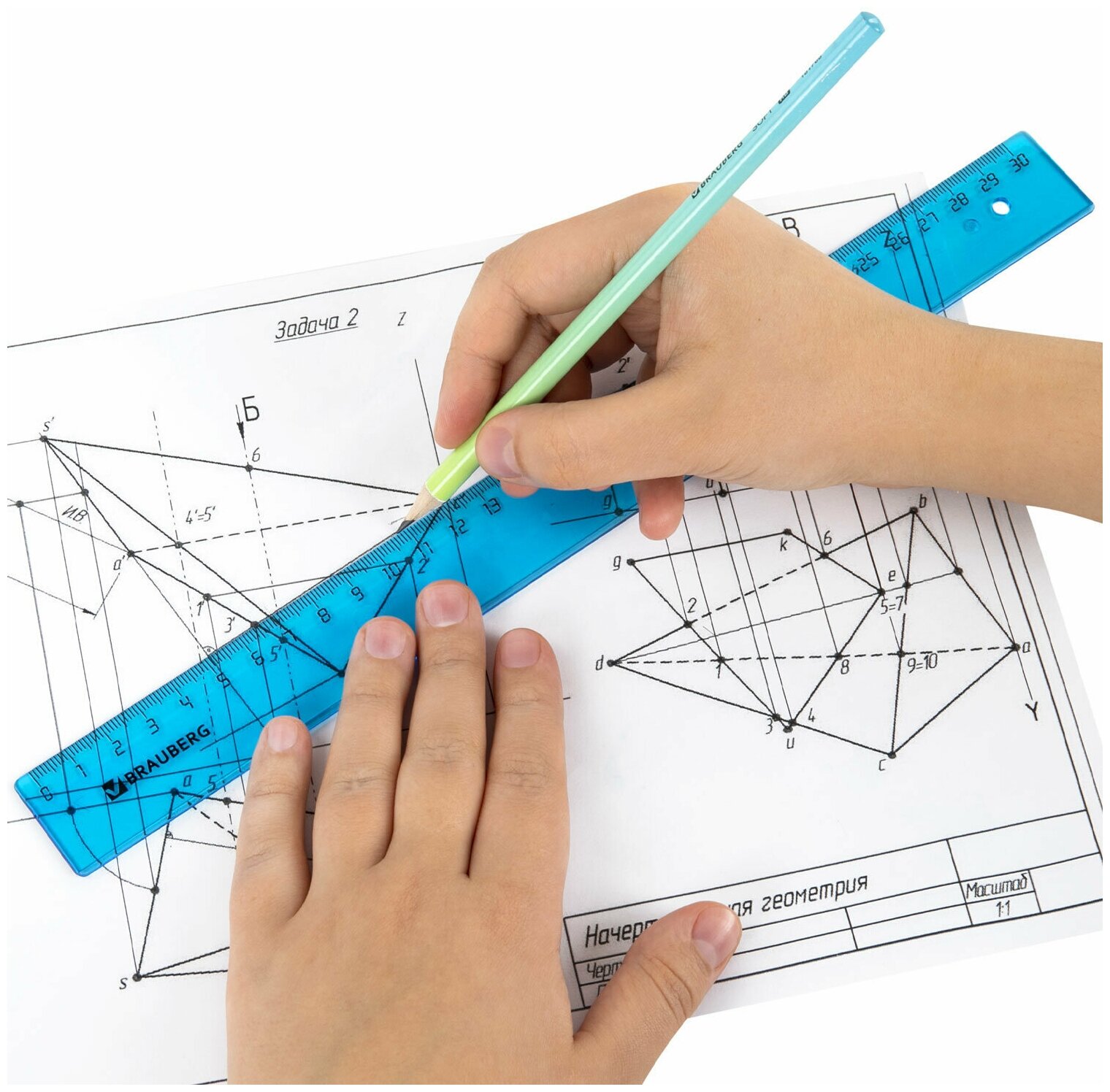 Выполнена из прочного прозрачного пластика, имеет безопасные закруглённые углы и четкую, контрастную шкалу делений. Предназначена для чертёжных работ.