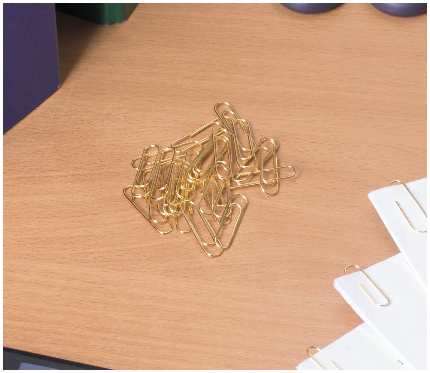 Скрепки изготовлены из стали, имеют классическую овальную форму и золотистый цвет. Длина скрепки составляет 28 мм. Не окисляются и не повреждают документы.