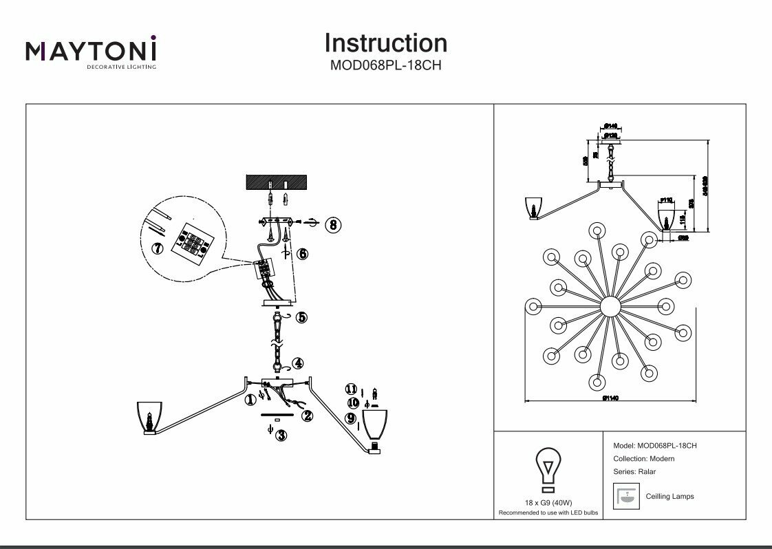 Подвесная люстра Ralar MOD068PL-18CH - продукт известной компании Maytoni (Германия). Имеет максимальную мощность 720 Вт, освещает площадь до 51 кв. м. Отлично подойдет для таких мест, как гостиная, кафе, холл. Впишется в интерьеры следующих стилей: модерн.