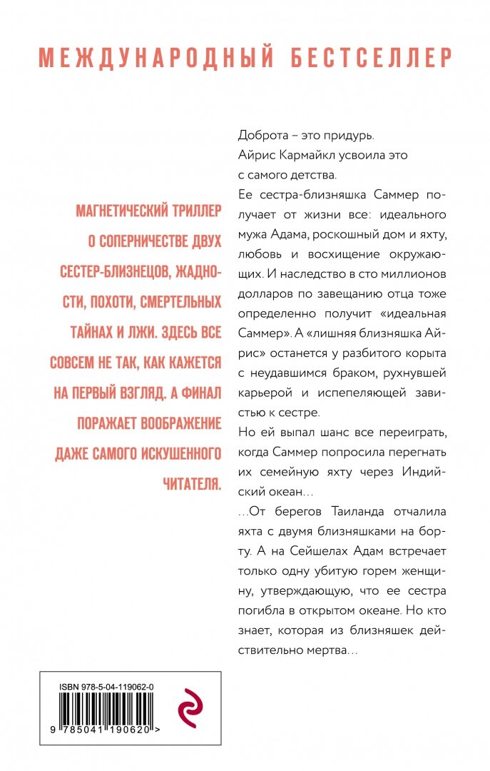 Ее сестра-близняшка Саммер получает от жизни все: идеального мужа Адама, роскошный дом и яхту, любовь и восхищение окружающих. И наследство в сто миллионов долларов по завещанию отца тоже определенно получит «идеальная Саммер». А «лишняя близняшка Айрис» останется у разбитого корыта с неудавшимся браком, рухнувшей карьерой и испепеляющей завистью к сестре. Но ей выпал шанс все переиграть, когда Саммер попросила перегнать их семейную яхту через Индийский океан…