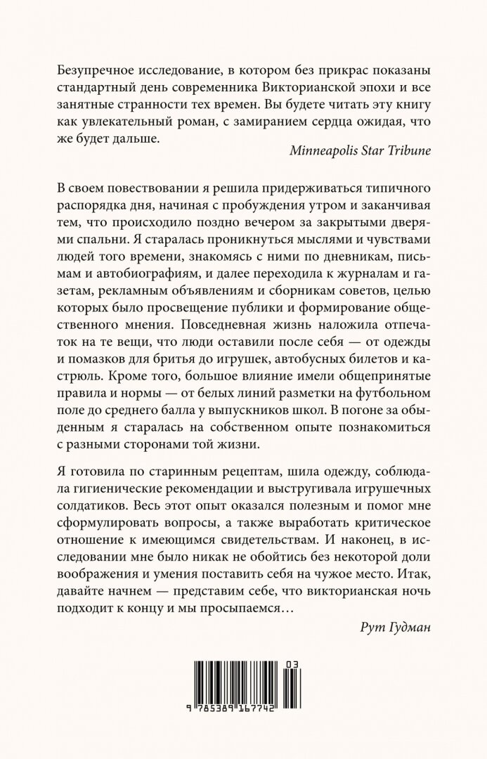 "Я хочу изучить историю частного, личного, материального, которая воспевает обыденность и позволяет воссоздать жизнь простых людей, взрослых и детей, через соприкосновение с их бытом. Я намереваюсь понять, как мыслили наши предки, узнать об их надеждах, страхах и домыслах. Я рассмотрю все стороны бытовых будней викторианцев и приглашаю вас туда, где сама бродила в поисках следов той эпохи. В попытках постичь прошлое я с самого начала уделяла много внимания экспериментальному аспекту. Мне нравится погружаться в изучение тех вещей, которые люди создавали и использовали в прошлом, и на собственном опыте узнавать, как это работало" (Рут Гудман)