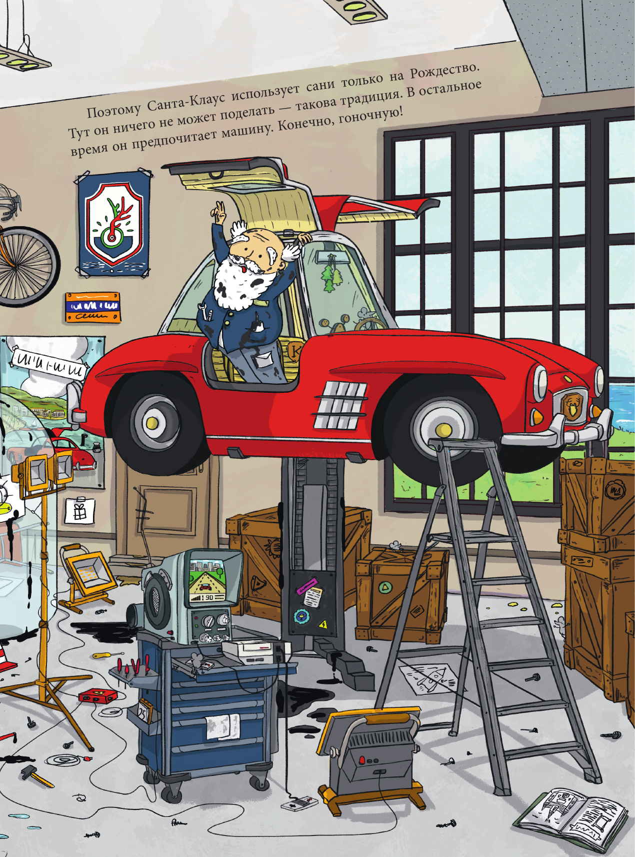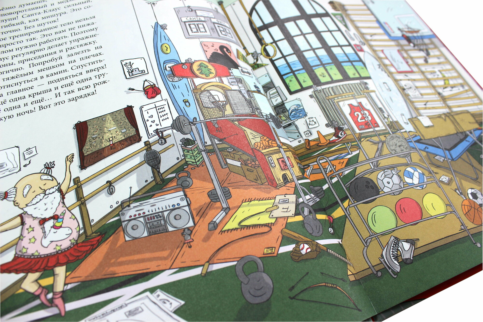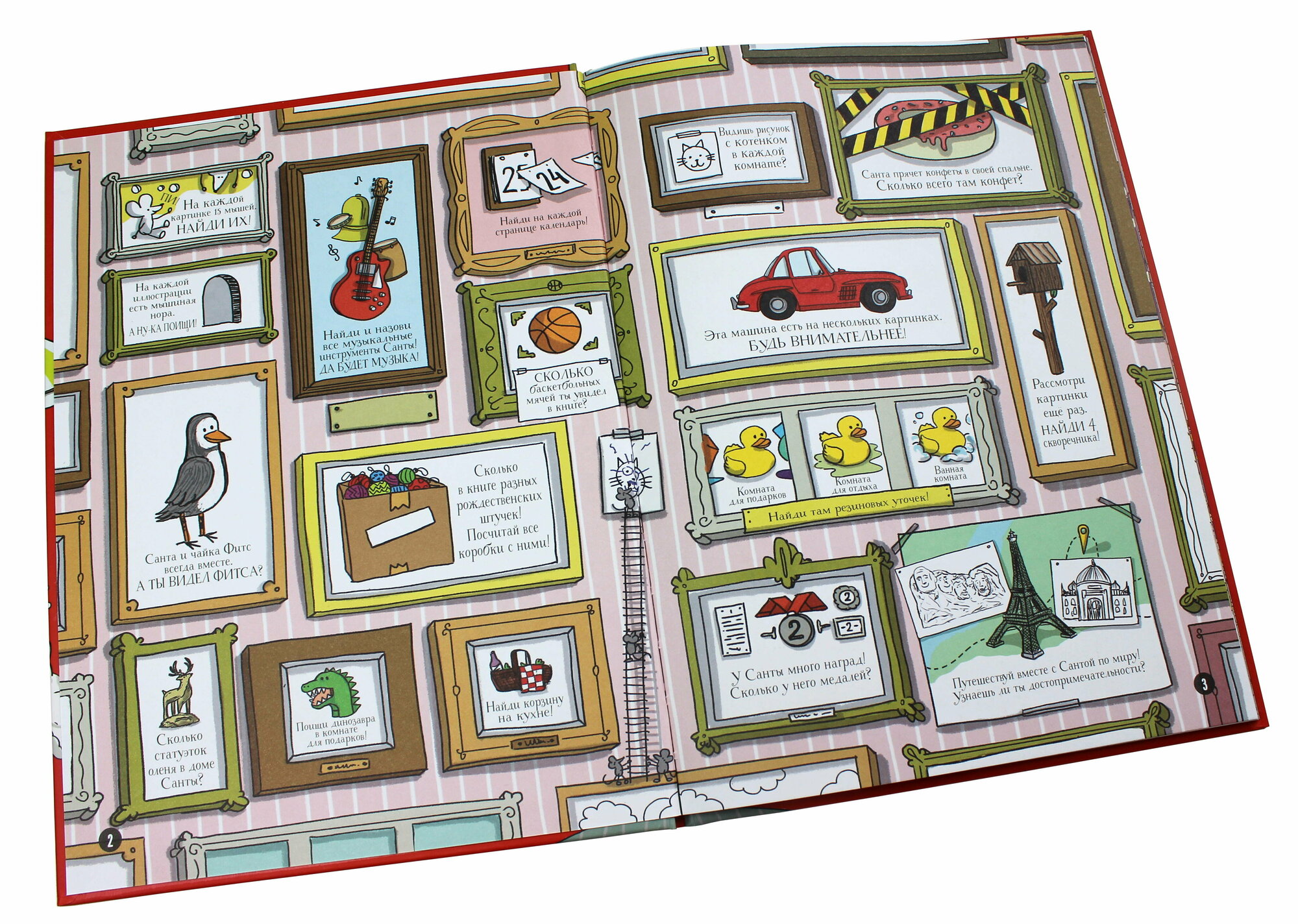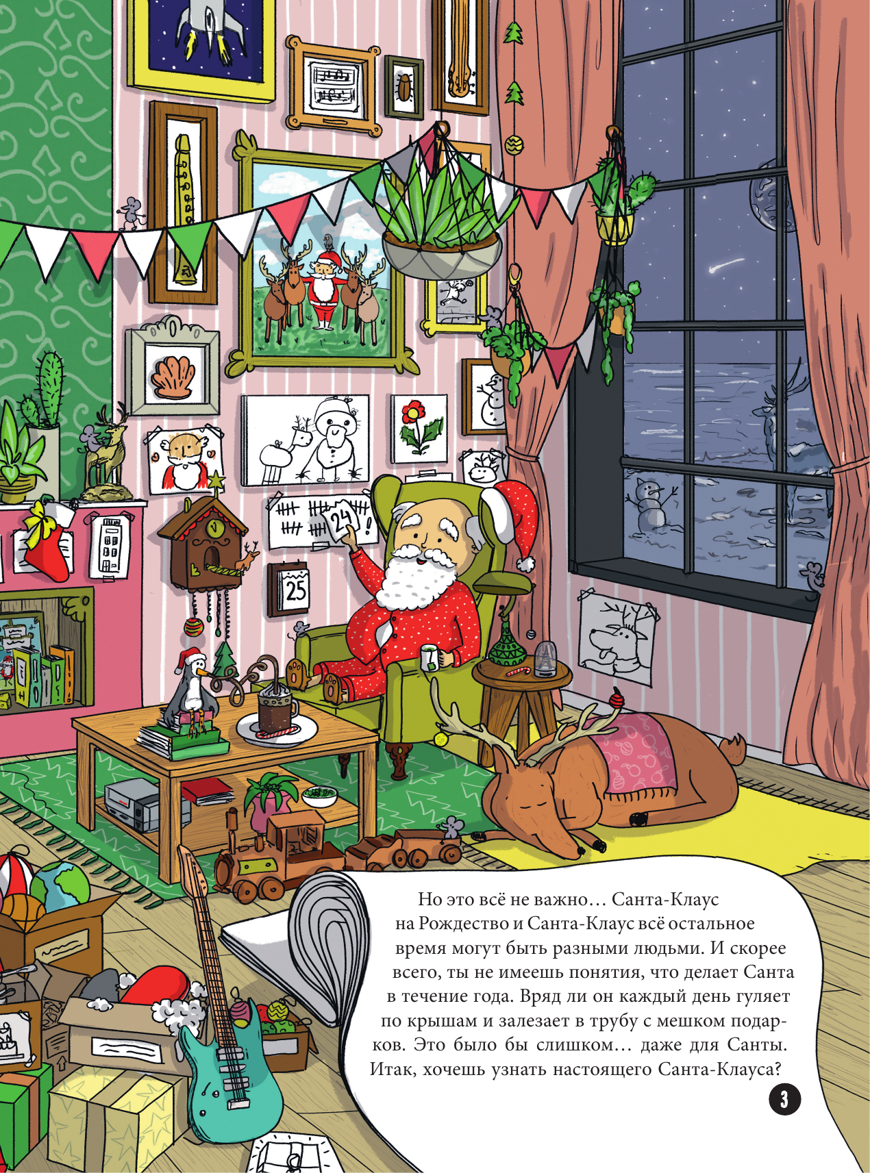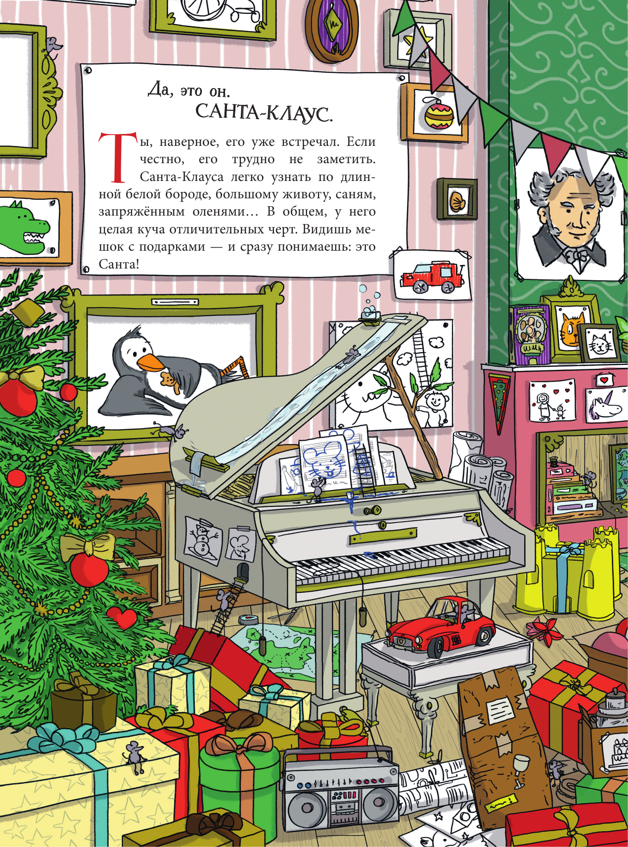 Очень забавная детская книжка, брала в подарок на Новый год. Все детишки прекрасно знают кто такой Санта Клаус, но мало кто знает чем же он занимается в свободное от Рождества время, ведь в этой книге он приглашает вас к себе в гости. Оказывается Санта тоже наряжает деревья, любит рисовать, играть на пианино, чинить свою машину в гараже, и конечно составлять списки подарков. В книге много иллюстраций, есть даже задания на поиск предметов; рекомендую:)