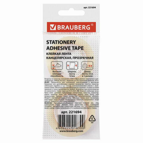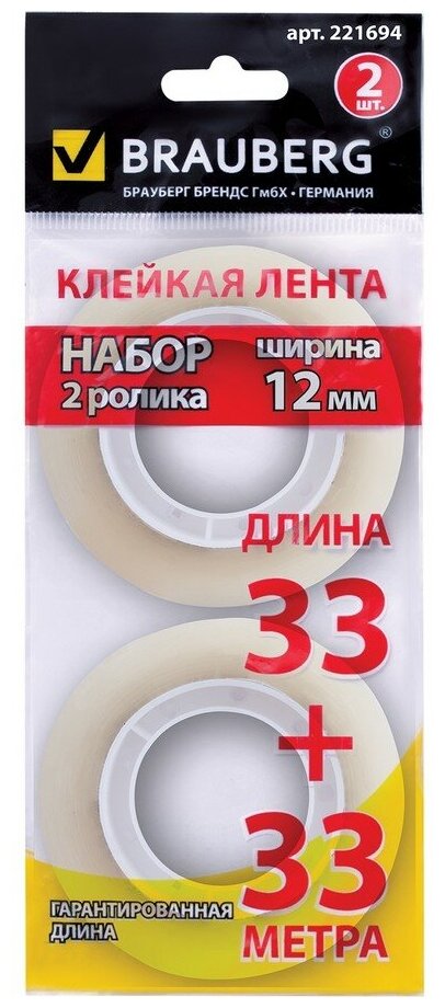 Канцелярская клейкая лента BRAUBERG. Гарантированная длина и ширина. Характеристики Ширина ленты - 12 мм. Длина ленты - 33 м. Толщина - 35 микрон. Прозрачная. Высокая клеящая способность. Комплект - 2 шт. Упаковка с европодвесом.