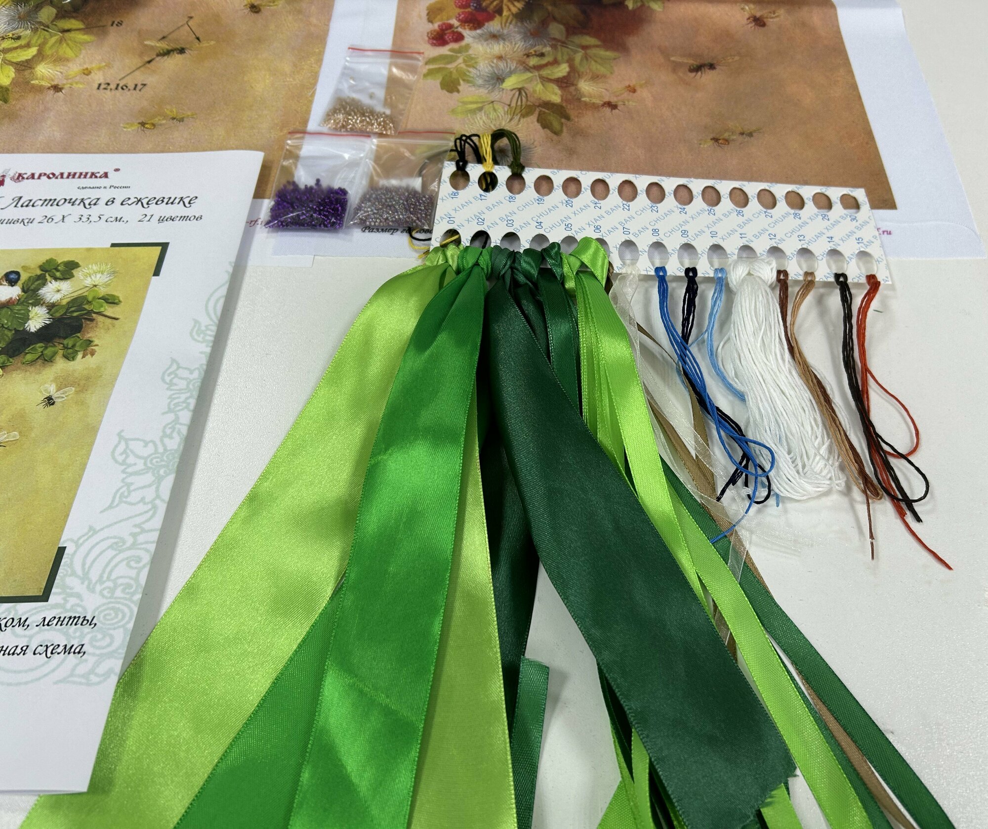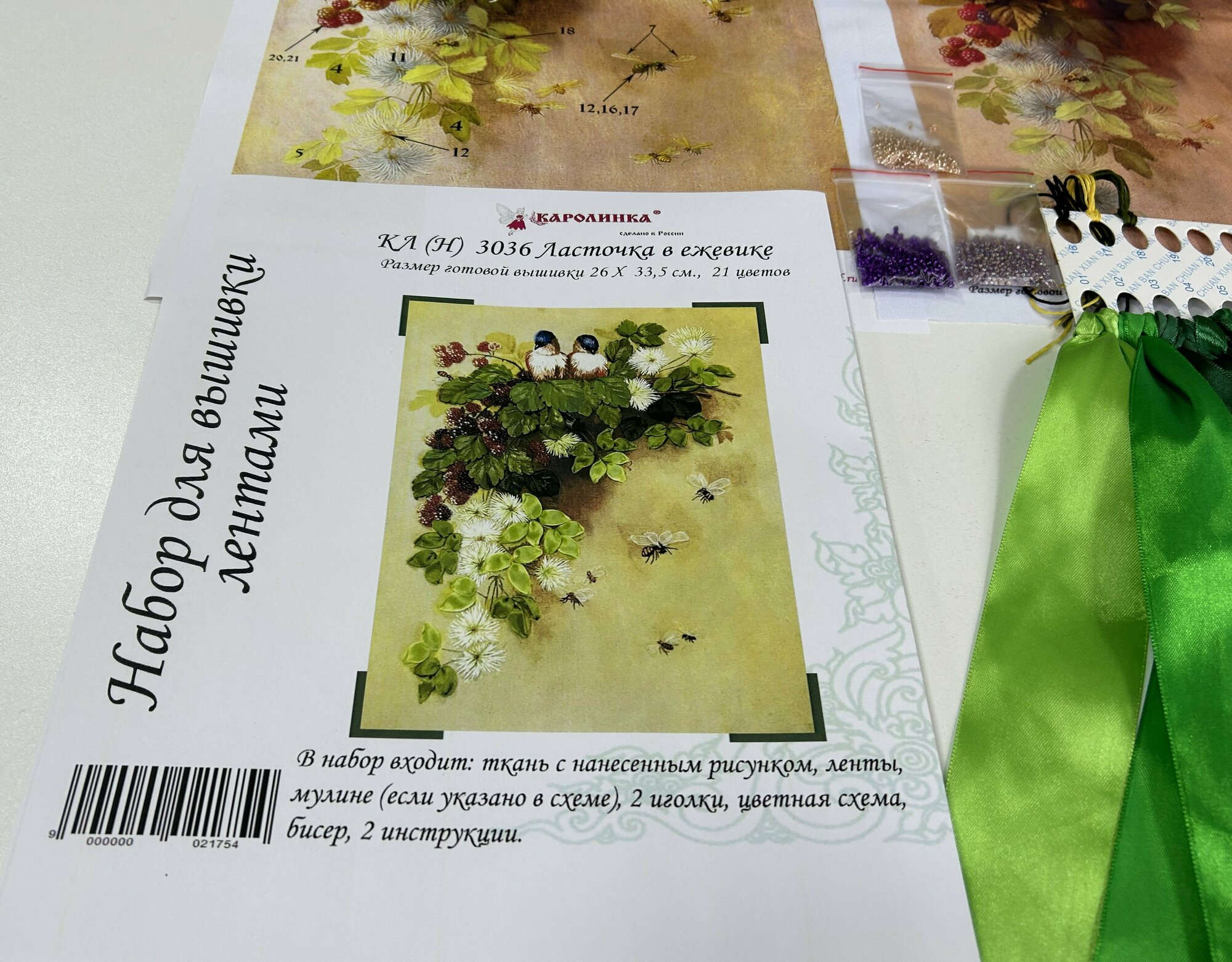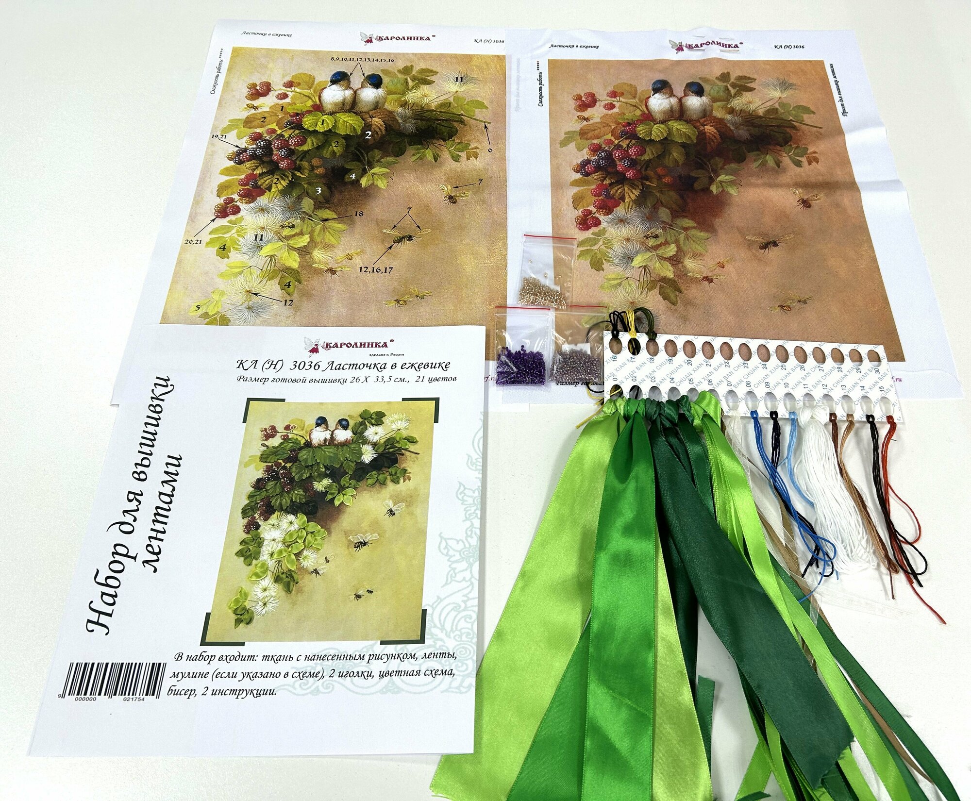 | В набор входит | Ткань с нанеченным рисунком (габардин), ленты атласные разных размеров (100% полиэстер) на органайзере, мулине х/б на органайзере, бисер, иголка, цветная символьная схема на бумаге, 2 инструкции (подробная по вышивке набора и подробная по стежкам) |