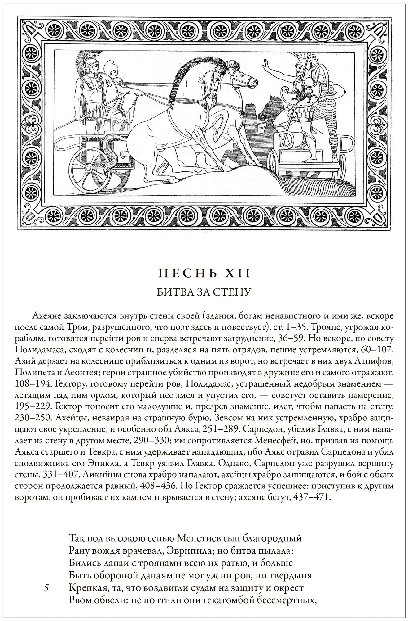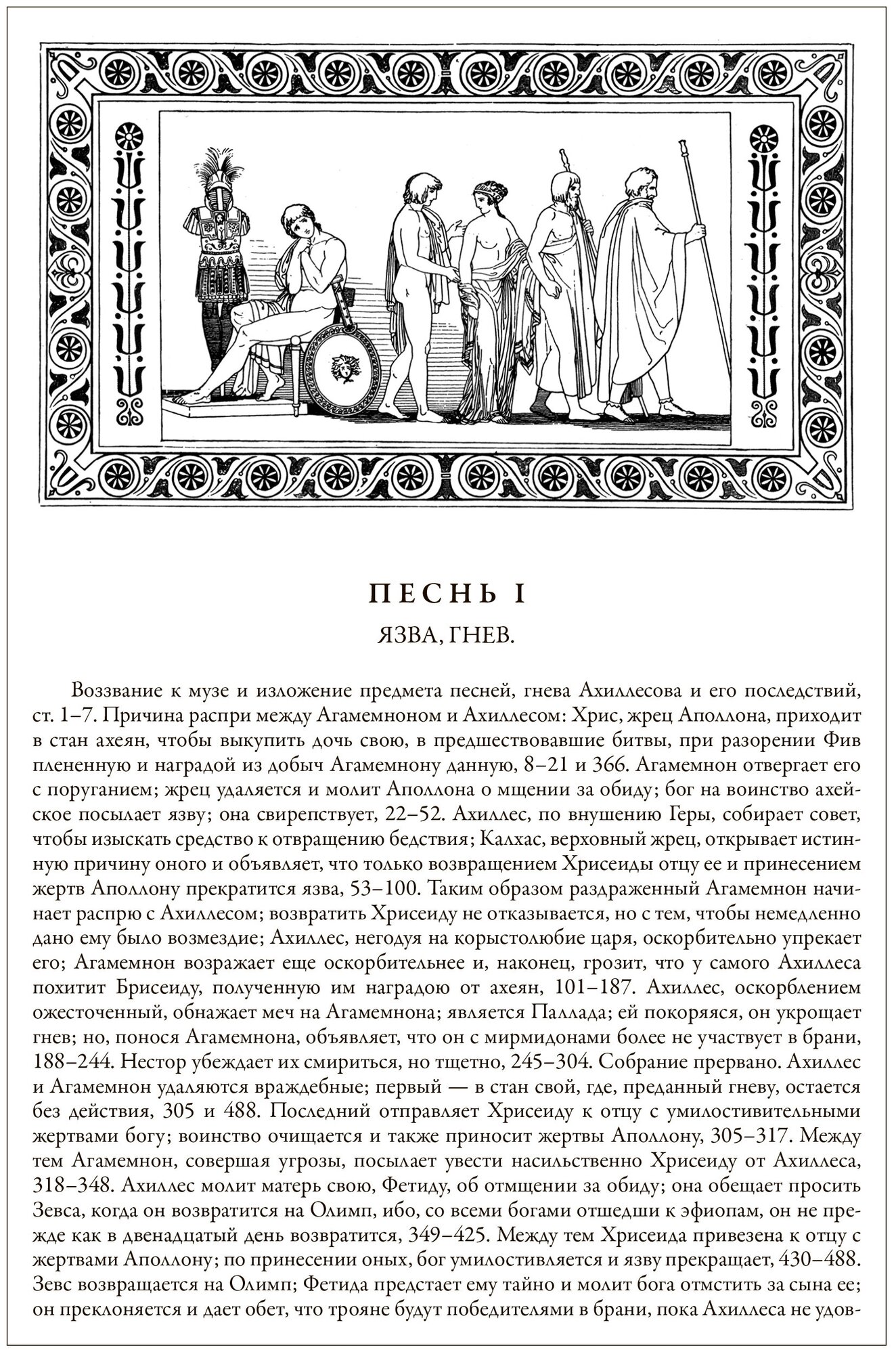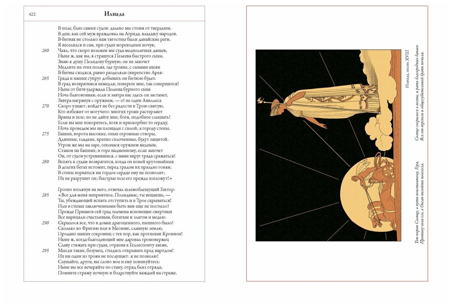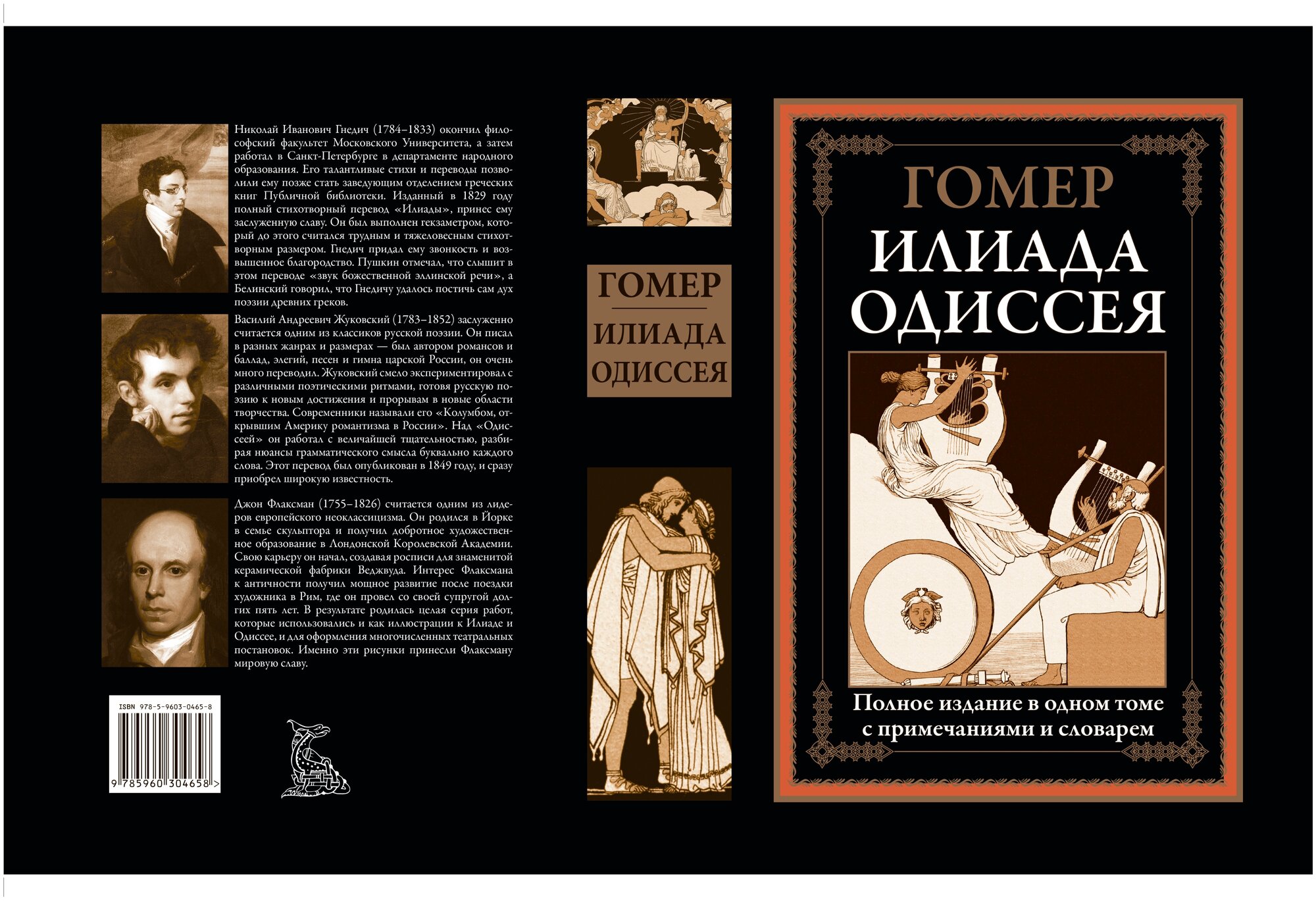 Классические поэмы Гомера "Илиада" и "Одиссея" даны в переводах Н. И. Гнедича и В. А. Жуковского, которые считаются классическими и наиболее полно передают особенности оригиналов. Вступительный очерк об эпосе Гомера написан знаменитым философом и поэтом Вячеславом Ивановым. В издании использованы рисунки английского художника Джона Флаксмана, которые принесли ему международную известность. Словарь в конце книги помогает читателям полнее воспринимать отношения между героями и богами, упоминаемыми в "Илиаде" и "Одиссее".