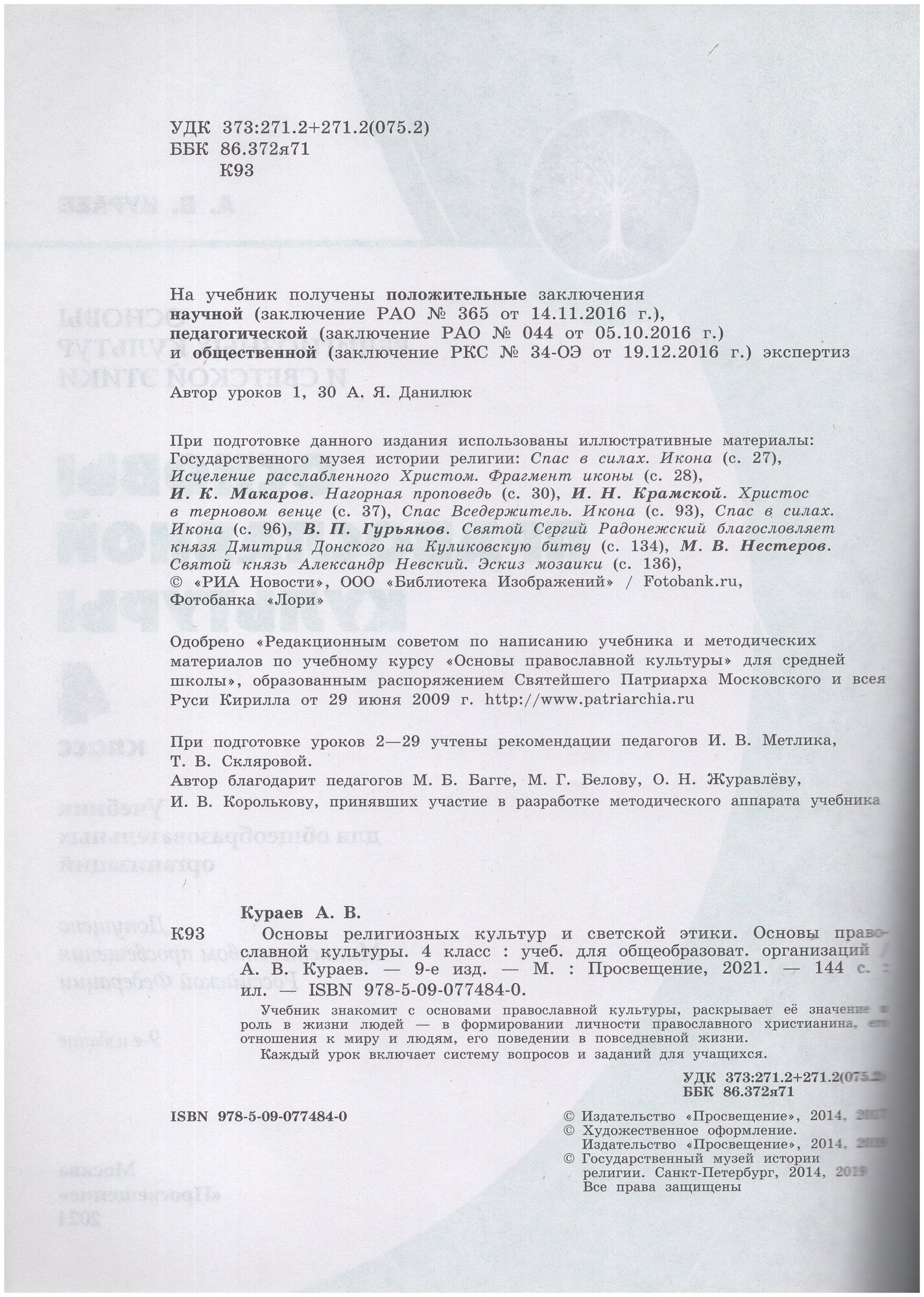 Основы религиозных культур и светской этики 4 класс Основы православной культуры Учебник (Кураев Андрей Вячеславович); Просвещение, 2021