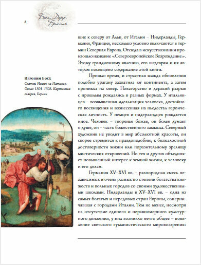 Книга подходит для новичков, которые хотят узнать больше о средневековых художниках - Дюрере, Брейгеле и Босхе. Для профессионалов покажется скучной. Из приятного - твёрдая обложка, мелованные страницы, достаточно крупная вёрстка текста, заметки на полях. Качество печати графики не самое высокое, но за обозначенную сумму я этого и не ждала. Краткий рассказ о самых значимых полотнах художников, об их жизни и художественной технике. Яркими картинками заинтересуются даже дети.